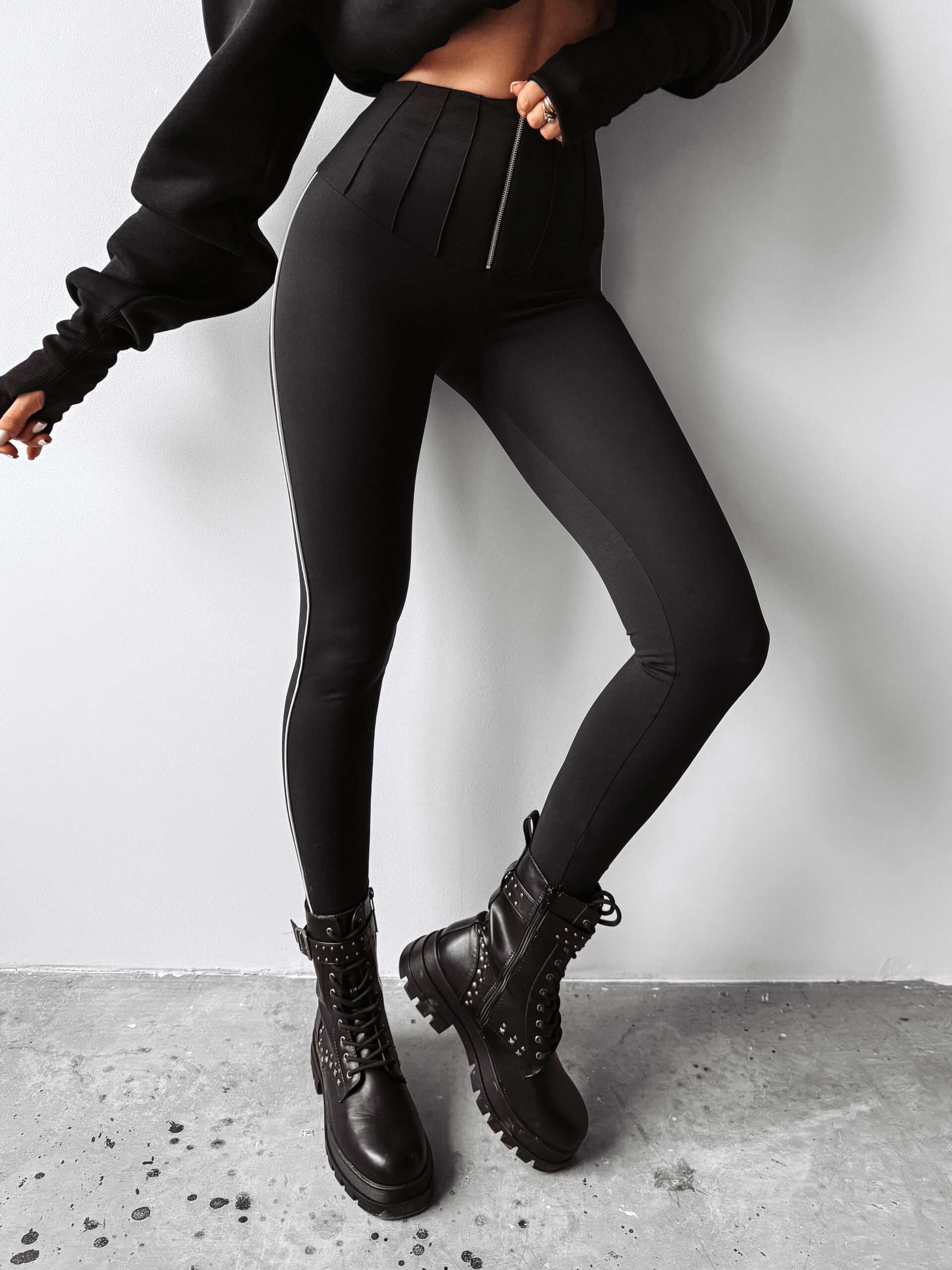 Przylegające legginsy wykonane z wysokiej jakości elastycznego materiału. Posiadają wysoki stan. Na przodzie zamek oraz delikatne przeszycia, który dodają uroku produktowi. Na tyle minimalistyczny haft z logo marki OLAVOGA. Po bokach lampasy.