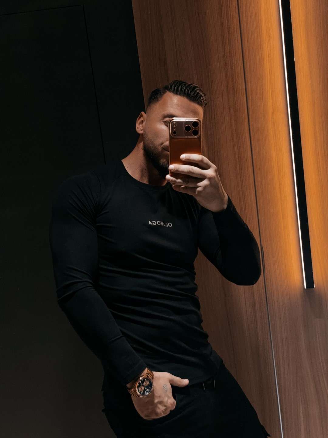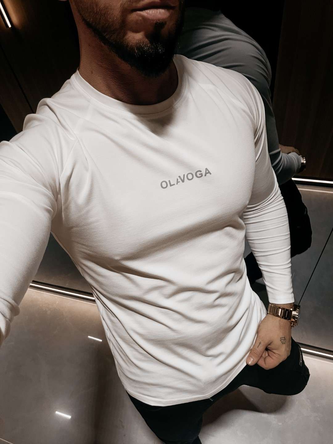 Klasyczny longsleeve męski typu slim. Wykonany z wysokiej jakości elastycznej bawełny. Na przodzie minimalistyczne, posrebrzane logo marki OLAVOGA. Tył zdobi obszerne logo brandu utrzymane w spójnej stylistyce, które nadaje stylizacji charakteru.