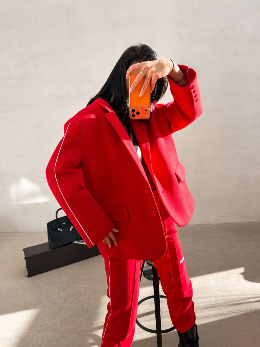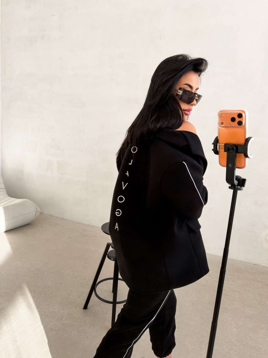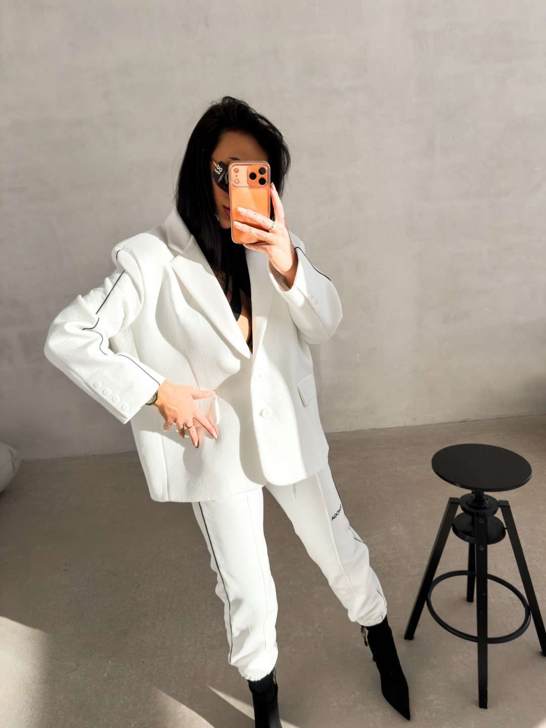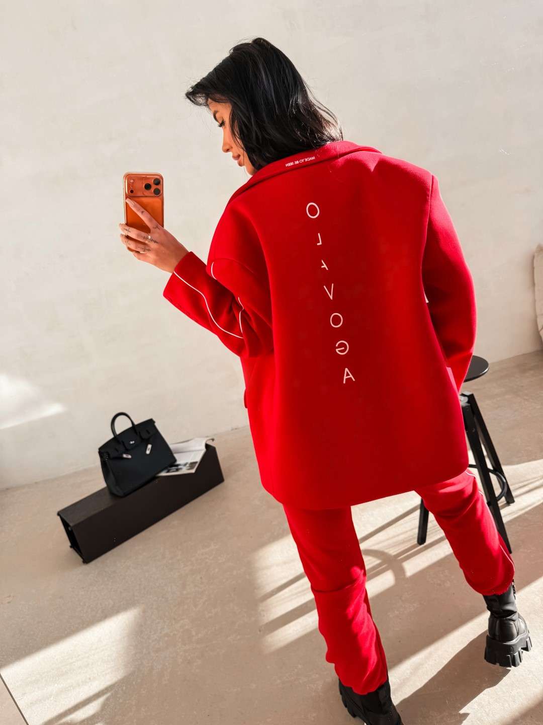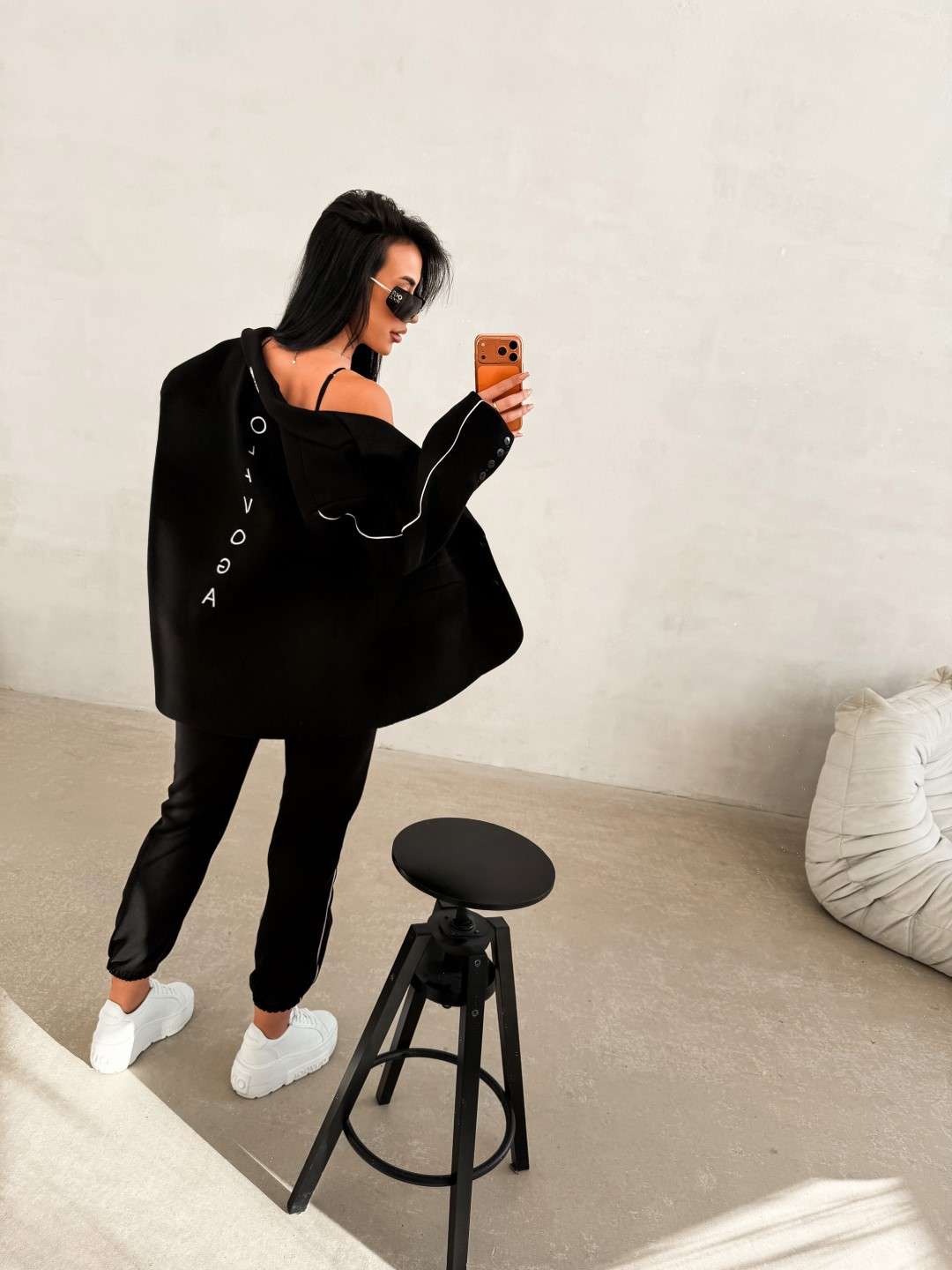 Klasyczna marynarka wykonana z gładkiej, przyjemnej w dotyku tkaniny o eleganckim wykończeniu. Model o prostym, lekko oversize’owym kroju. Marynarka z klasycznymi klapami oraz zapięciem na guziki. Na przodzie funkcjonalne kieszenie z klapami. Długie rękawy wykończone subtelnymi guzikami. Na plecach pionowe, minimalistyczne logo marki OLAVOGA. Dodatkowym detalem jest haft Made to be seen umieszczony przy kołnierzu. Tworzy idealny komplet ze spodniami FINIRE.