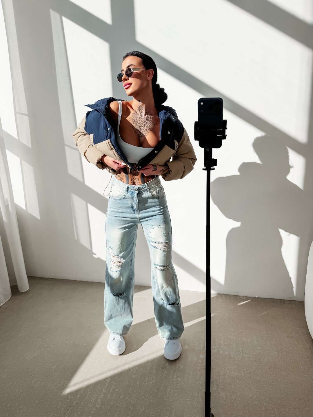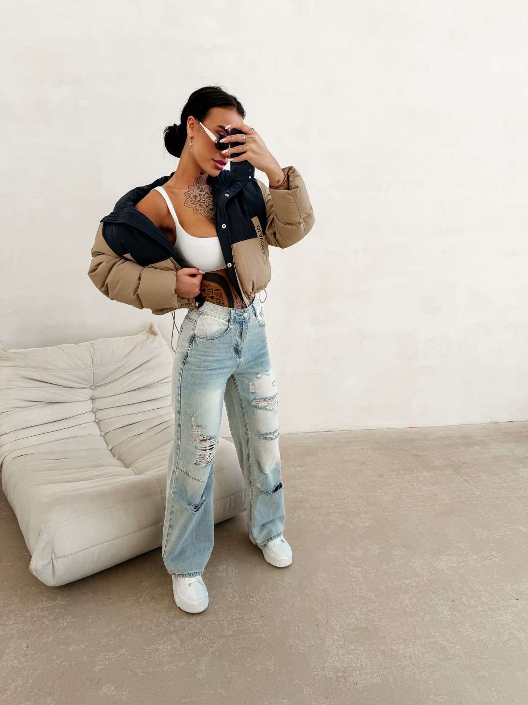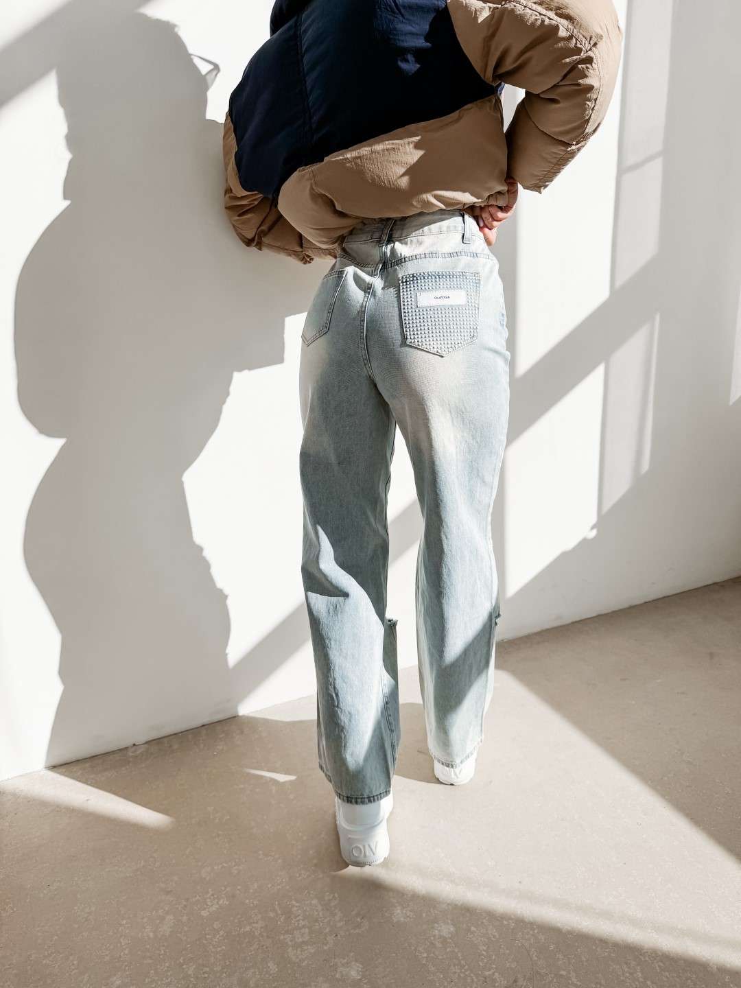 Jeansy o szerokiej nogawce z wysokim stanem. Model zapinany na suwak i guzik. Z przodu klasyczne kieszenie oraz efektowne przetarcia i rozdarcia. Z tyłu kieszenie z naszywką z logowaniem OLAVOGA.