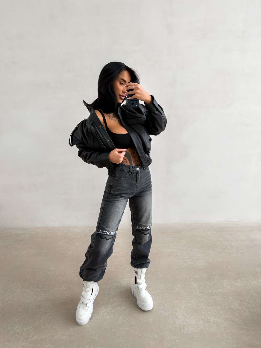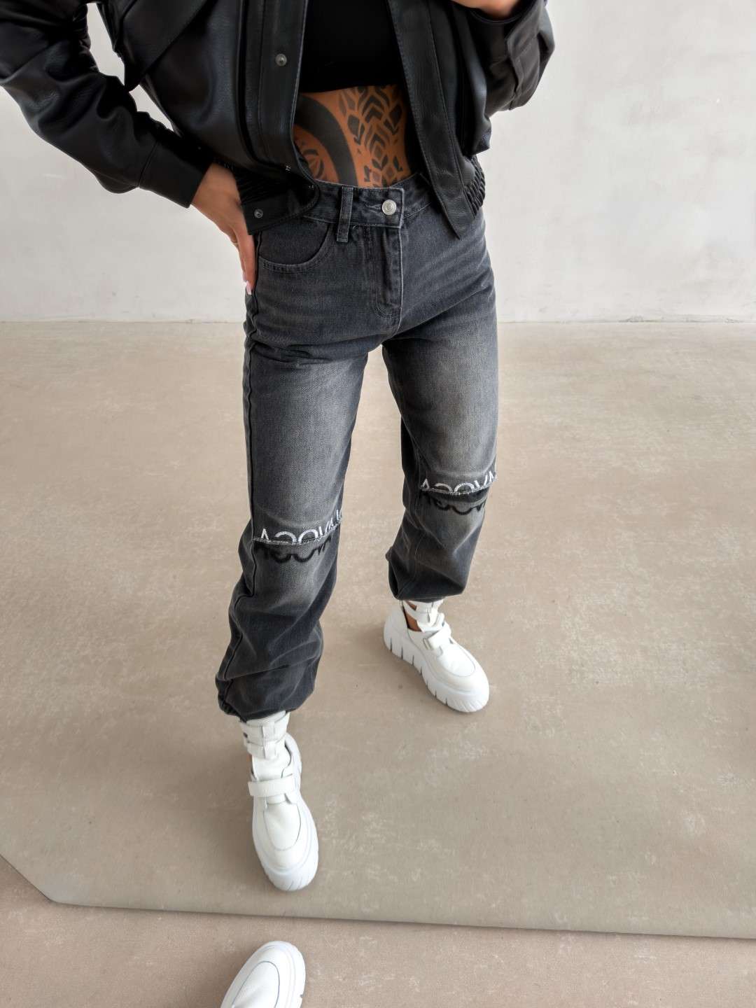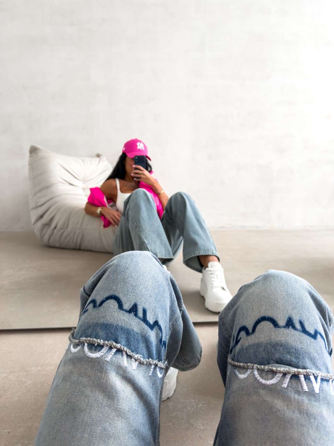 Jeansy o nowoczesnym, lekko rozszerzanym kroju, wykonane z wysokogatunkowego denimu o subtelnym efekcie sprania. Model z wysokim stanem, zapinany na guzik i suwak. Charakterystycznym elementem są poziome przeszycia na wysokości kolan z surowym wykończeniem oraz haftem z logo marki OLAVOGA. Nogawki delikatnie rozszerzane ku dołowi. Model wyposażony w klasyczne kieszenie z przodu i z tyłu.