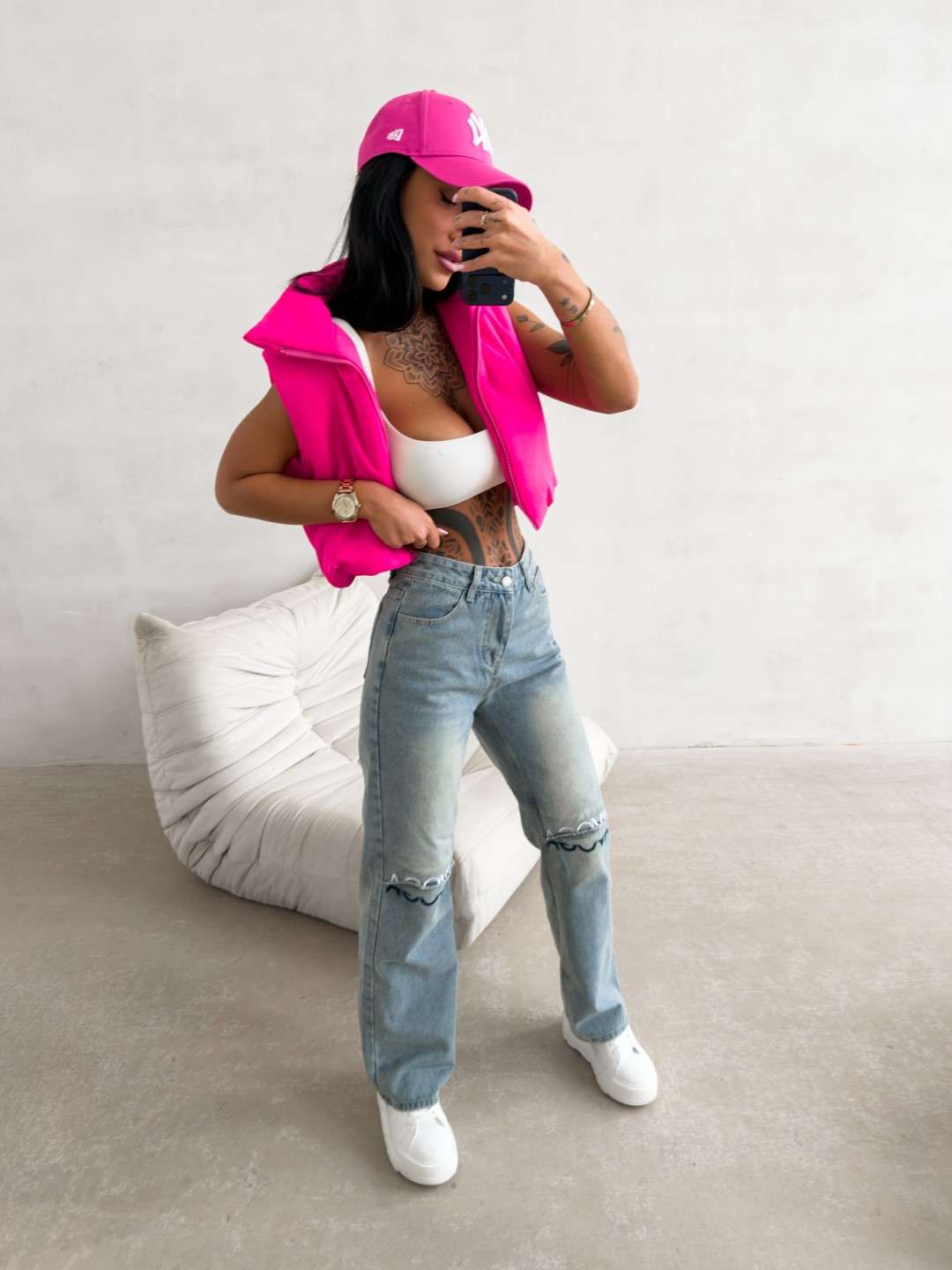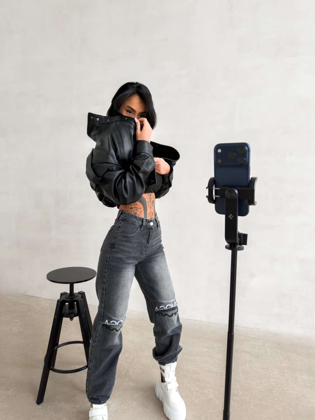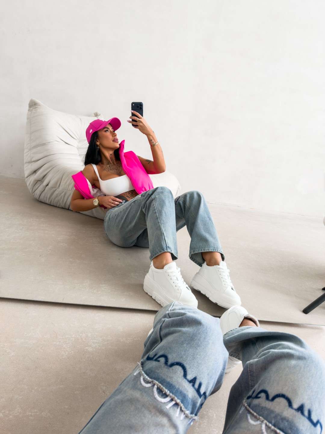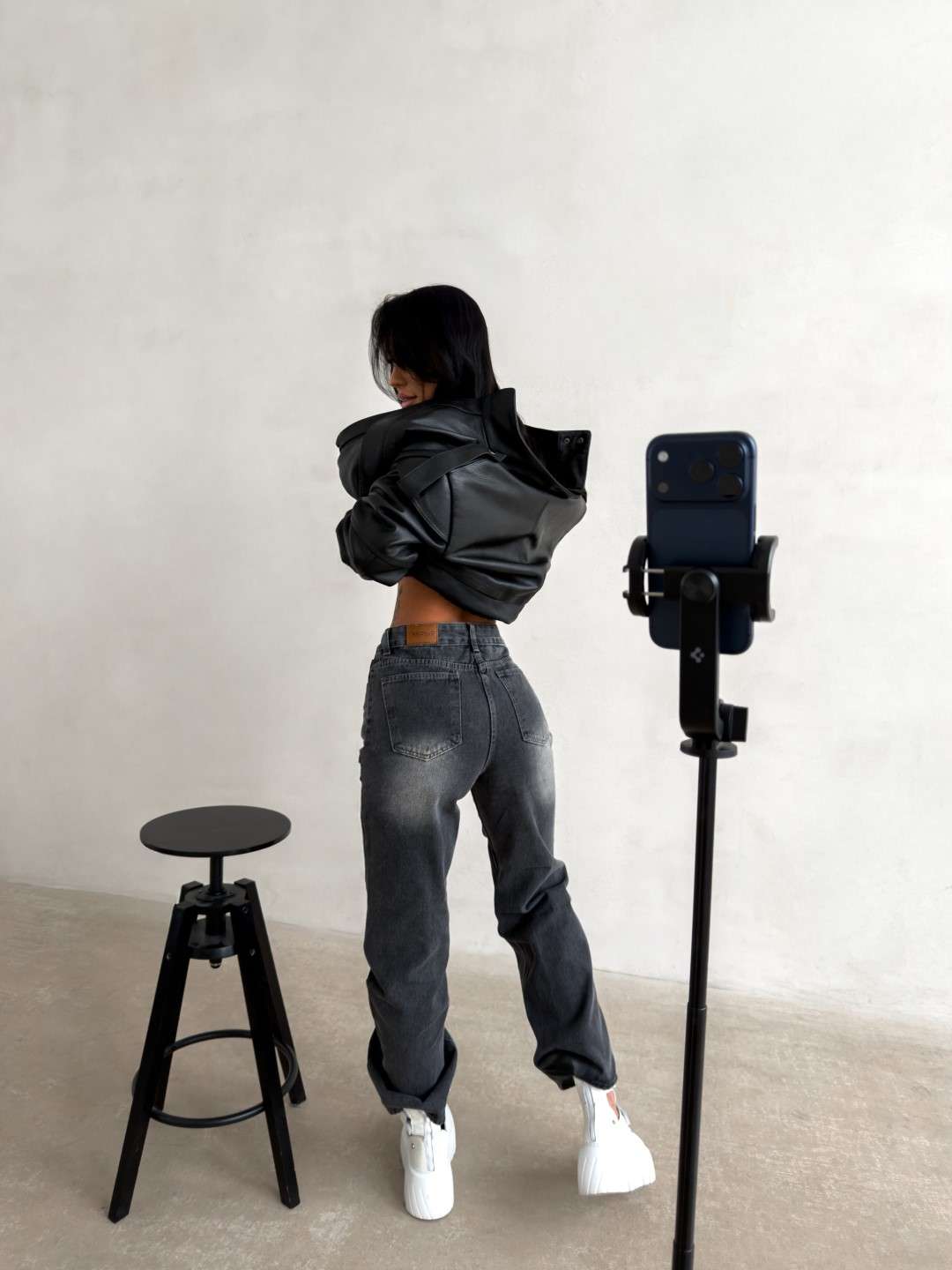 Jeansy o nowoczesnym, lekko rozszerzanym kroju, wykonane z wysokogatunkowego denimu o subtelnym efekcie sprania. Model z wysokim stanem, zapinany na guzik i suwak. Charakterystycznym elementem są poziome przeszycia na wysokości kolan z surowym wykończeniem oraz haftem z logo marki OLAVOGA. Nogawki delikatnie rozszerzane ku dołowi. Model wyposażony w klasyczne kieszenie z przodu i z tyłu.