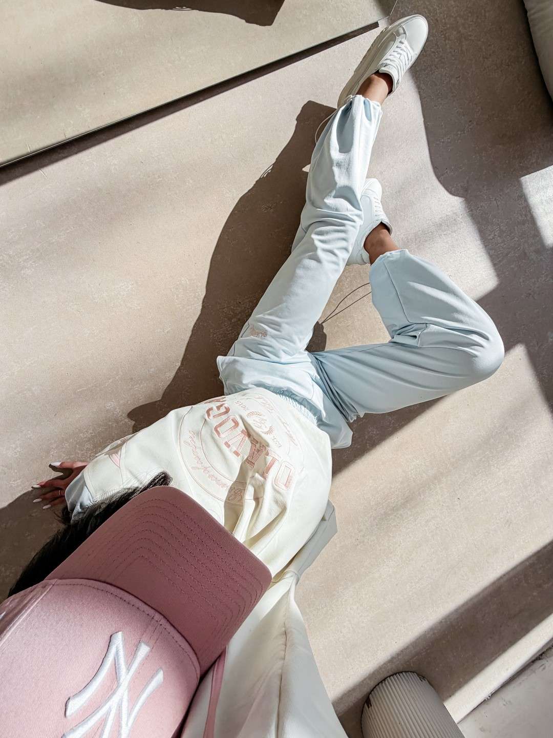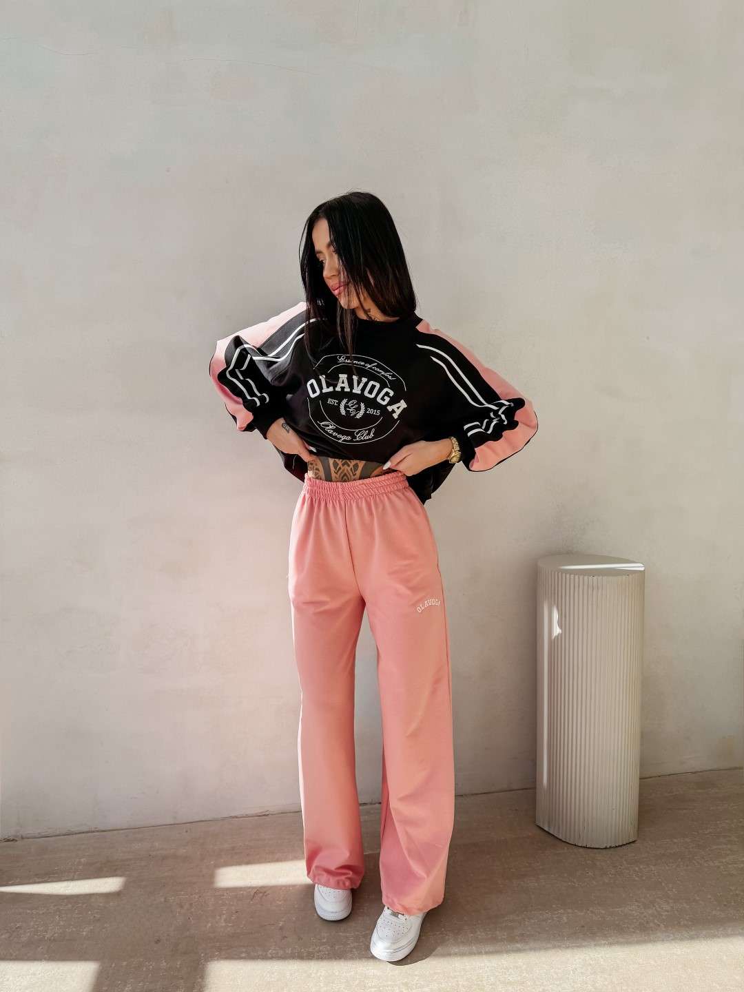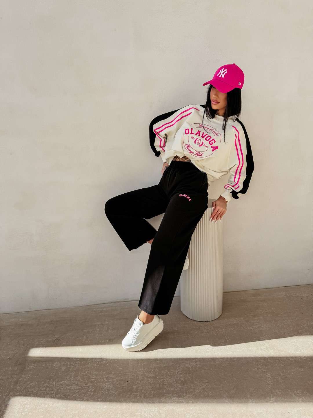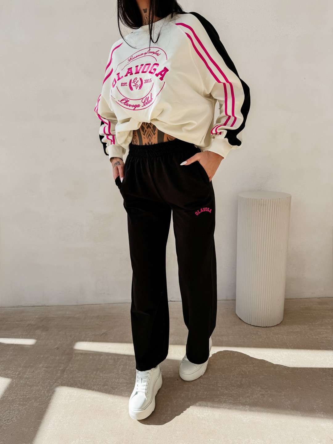 Spodnie dresowe o swobodnym kroju z elastyczną talią. Na przodzie subtelne logo OLAVOGA.