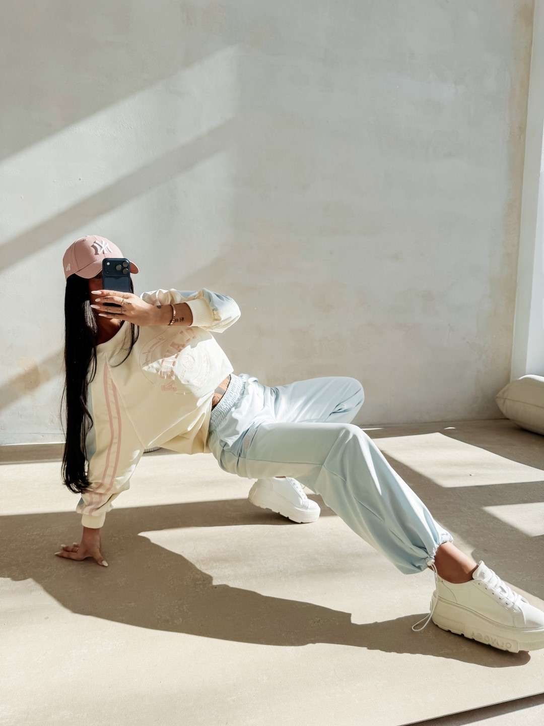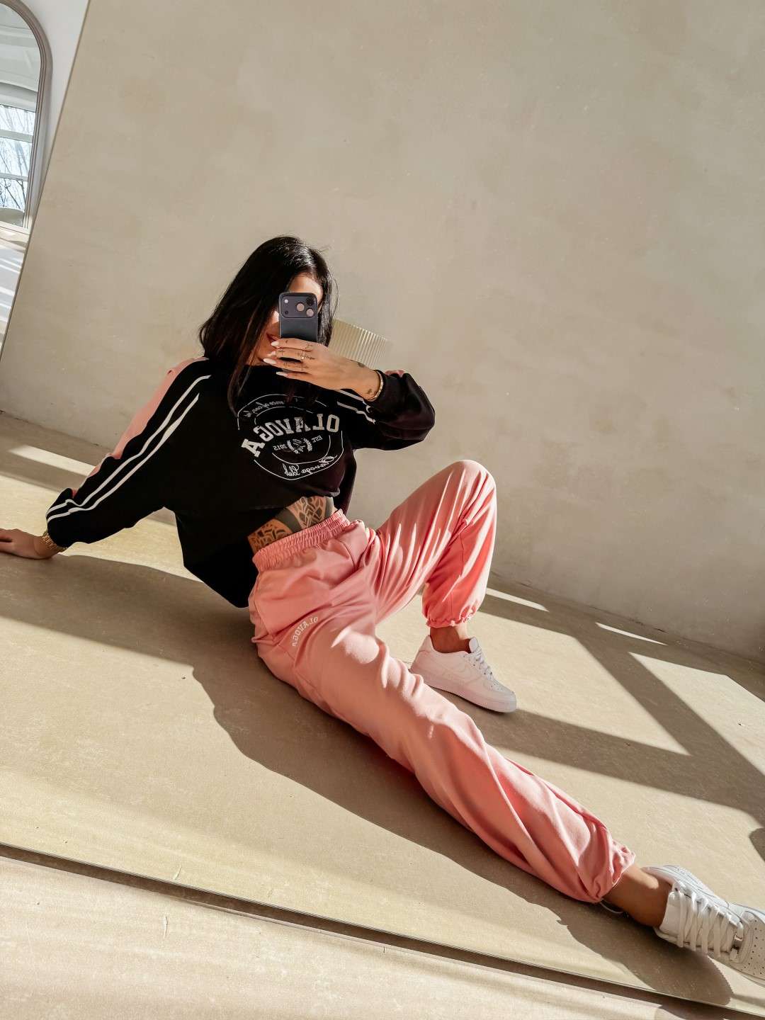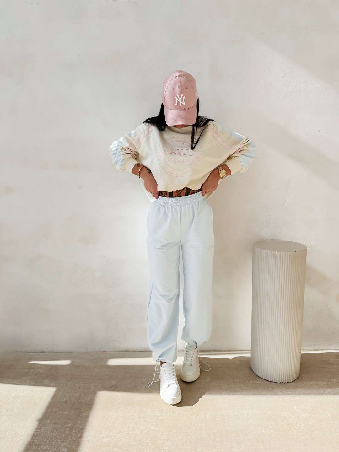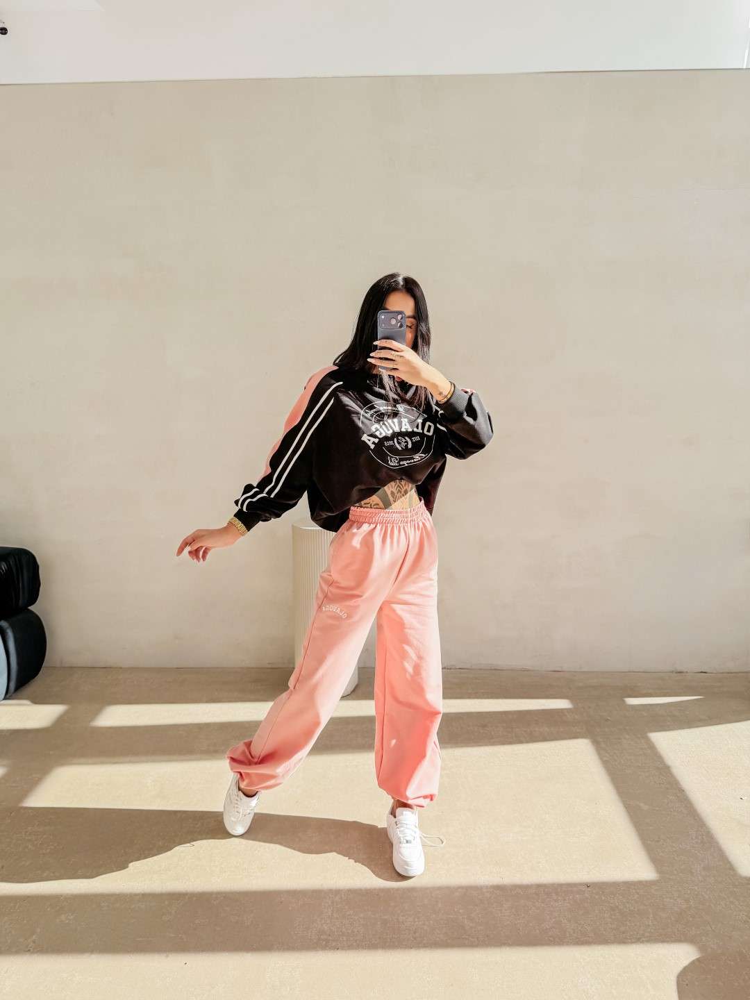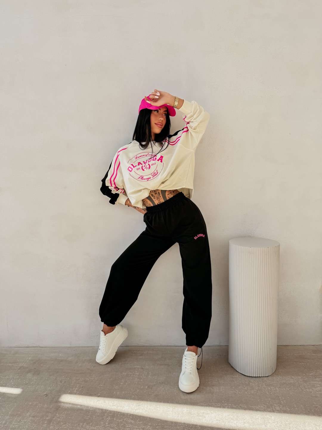 Spodnie dresowe o swobodnym kroju z elastyczną talią. Na przodzie subtelne logo OLAVOGA.