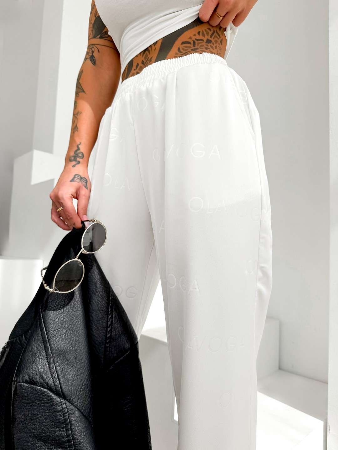 Spodnie z prostą, luźną nogawką. Wysoki stan z elastyczną gumą w pasie. Lekki, lejący materiał. Pokryte dużym monogramem z logo.