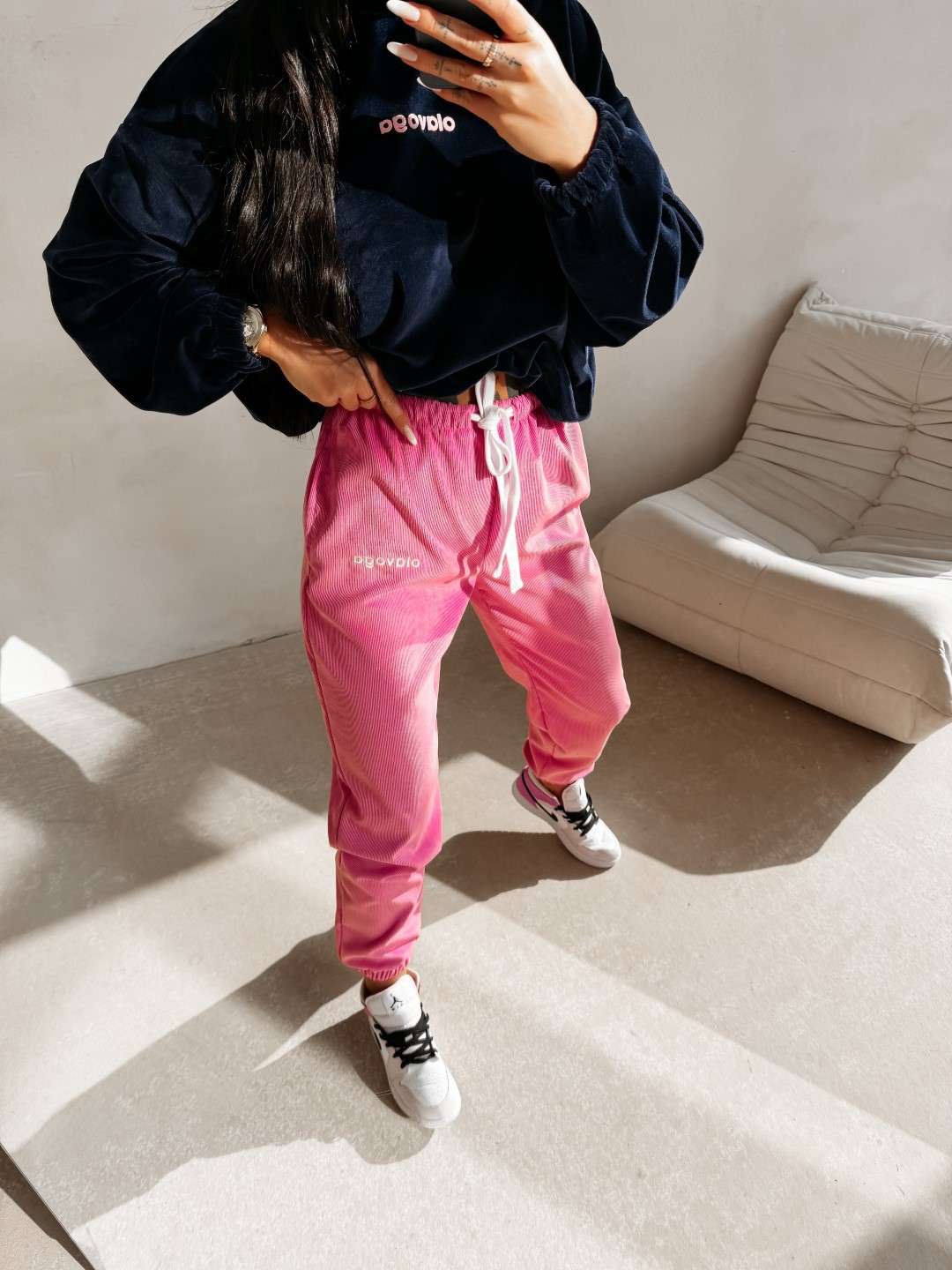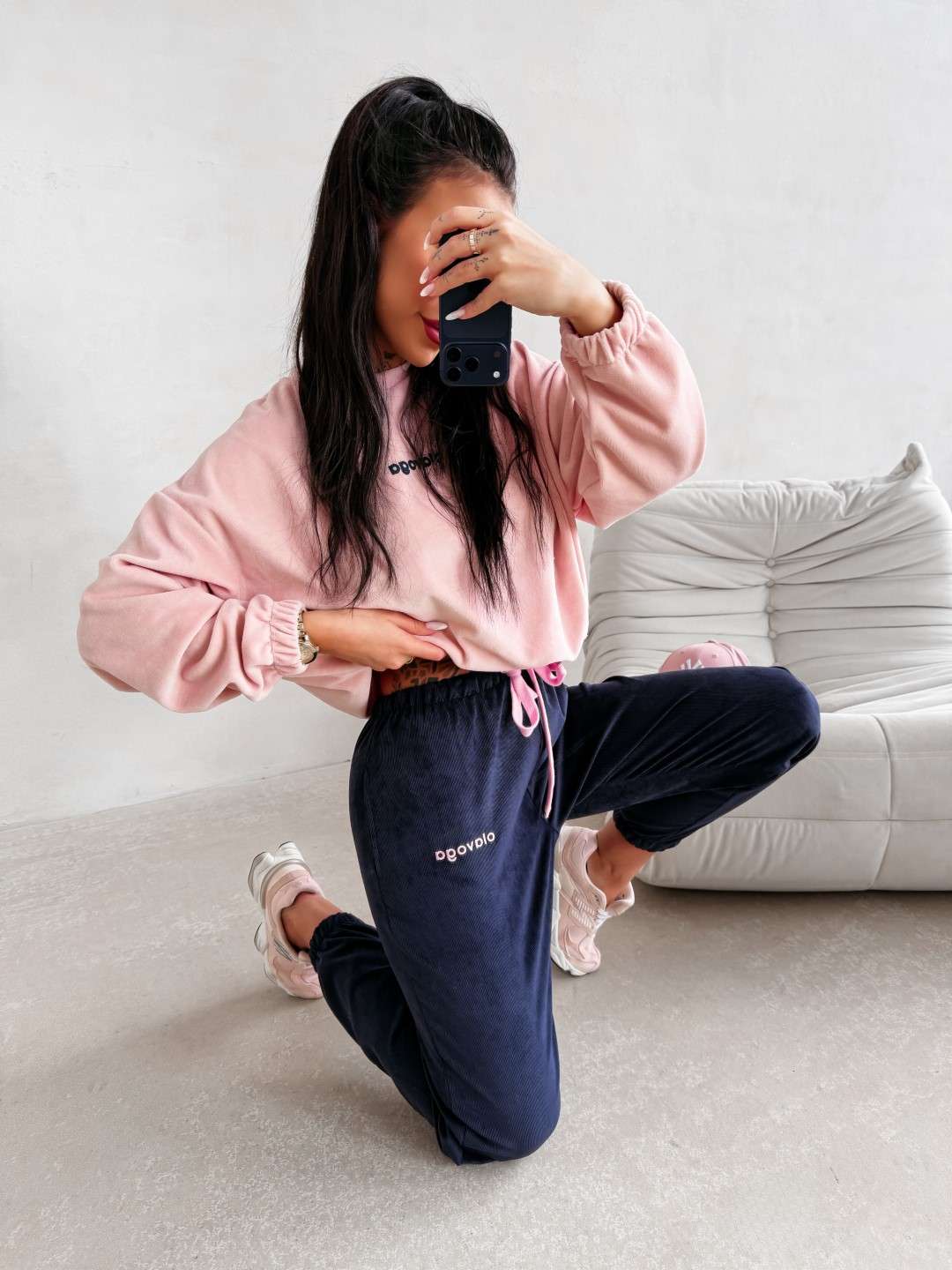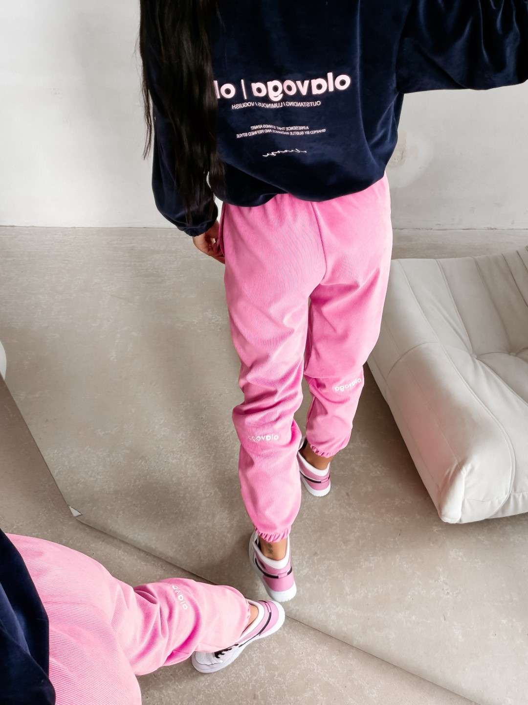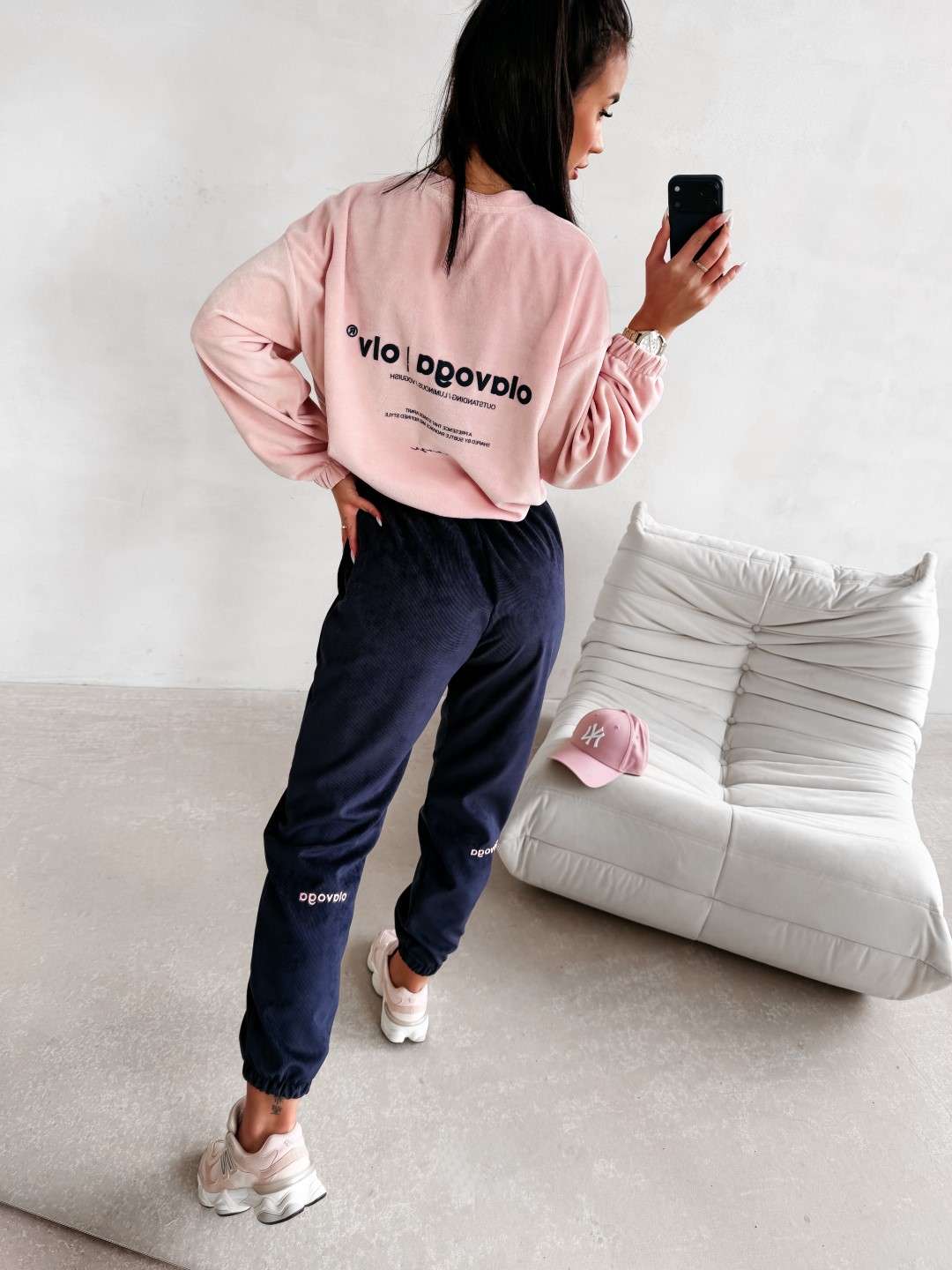 Wykonane z miękkiej, przyjemnej w dotyku dzianiny o subtelnej, welurowej strukturze. Nogawki wykończone ściągaczami oraz ozdobione delikatnym haftem OLAVOGA. Ważne aspekty: komfortowy fason, elastyczny pas z wiązaniem, miękka dzianina o welurowym wykończeniu, ściągacze przy nogawkach, haft marki OLAVOGA, casualowo-sportowy styl.