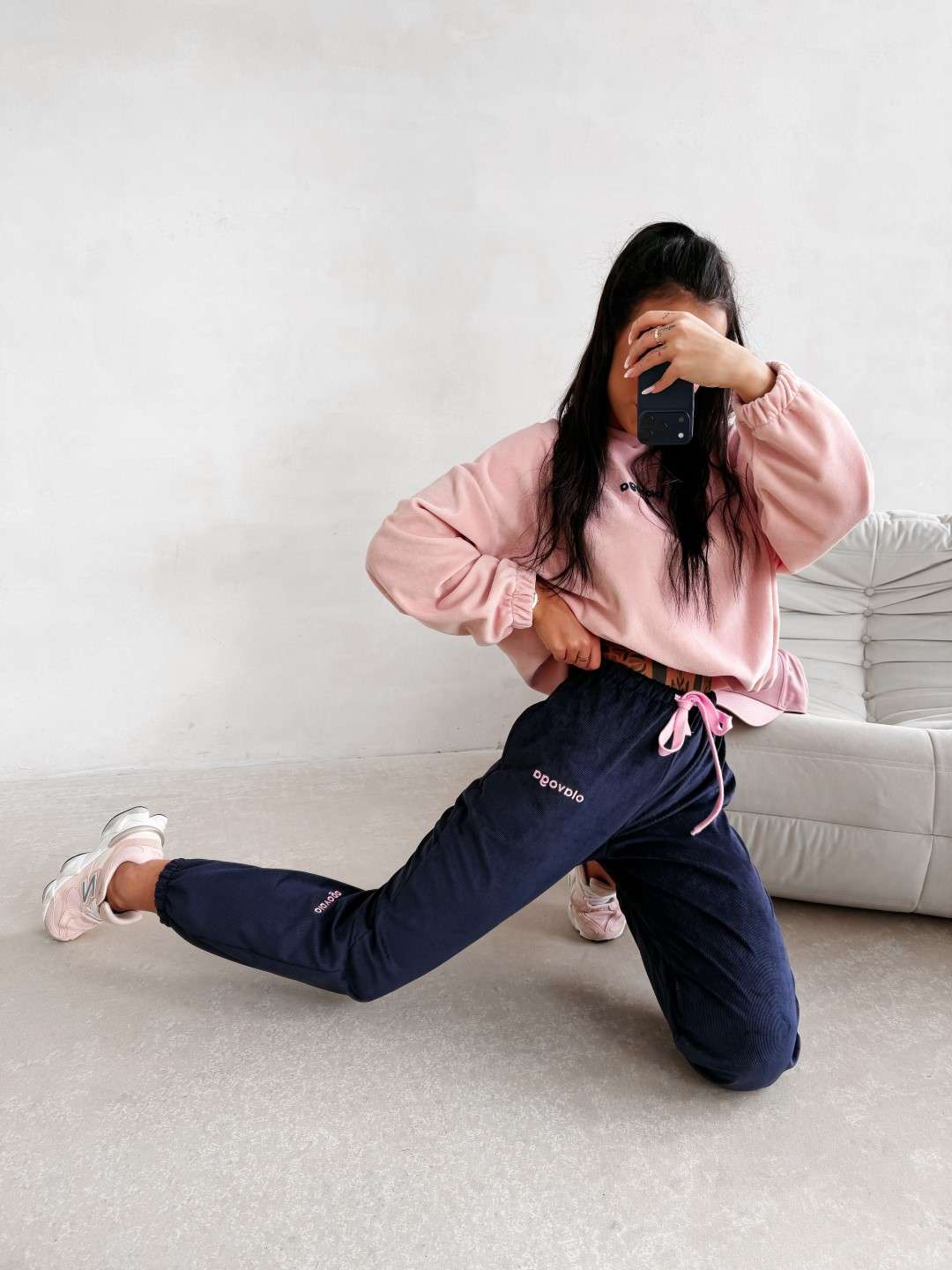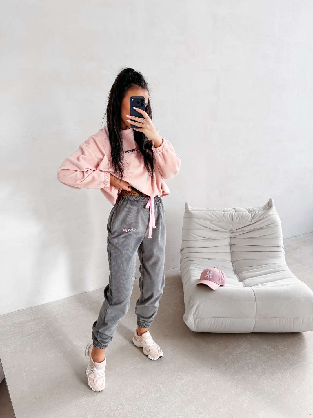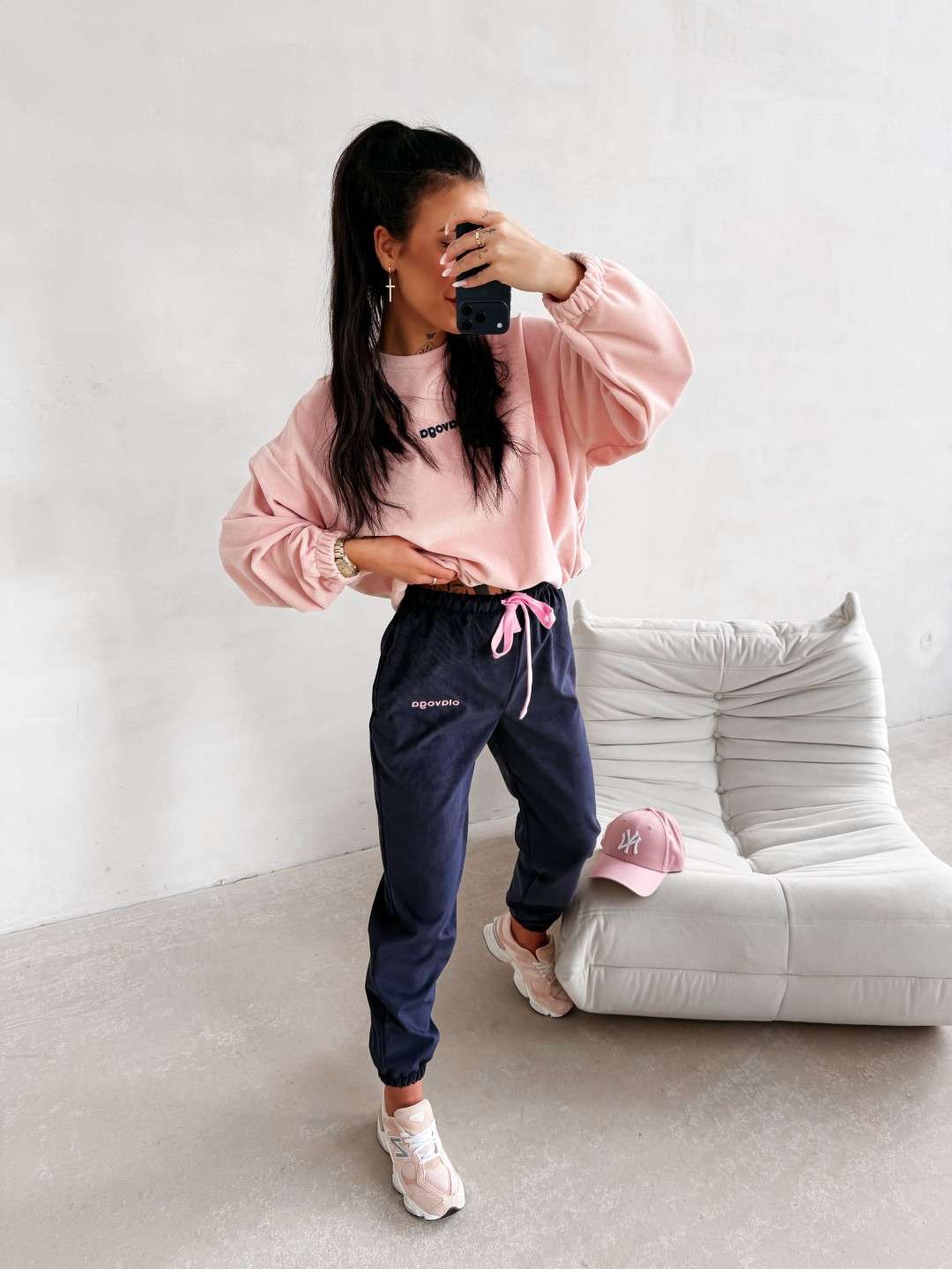 Wykonane z miękkiej, przyjemnej w dotyku dzianiny o subtelnej, welurowej strukturze. Nogawki wykończone ściągaczami oraz ozdobione delikatnym haftem OLAVOGA. Ważne aspekty: komfortowy fason, elastyczny pas z wiązaniem, miękka dzianina o welurowym wykończeniu, ściągacze przy nogawkach, haft marki OLAVOGA, casualowo-sportowy styl.