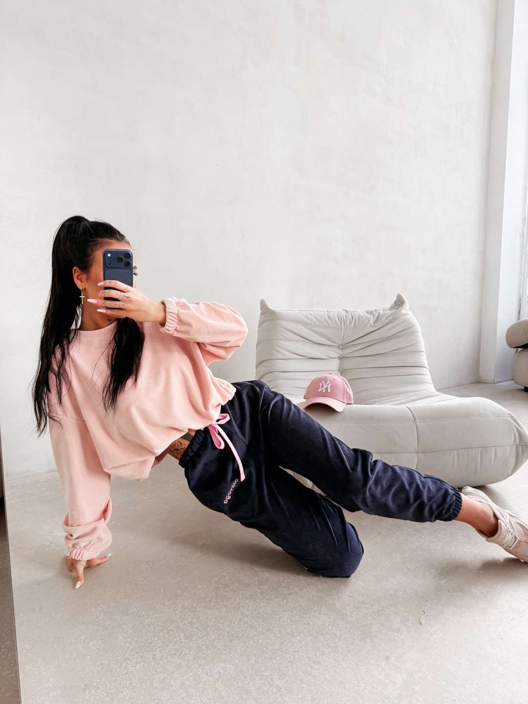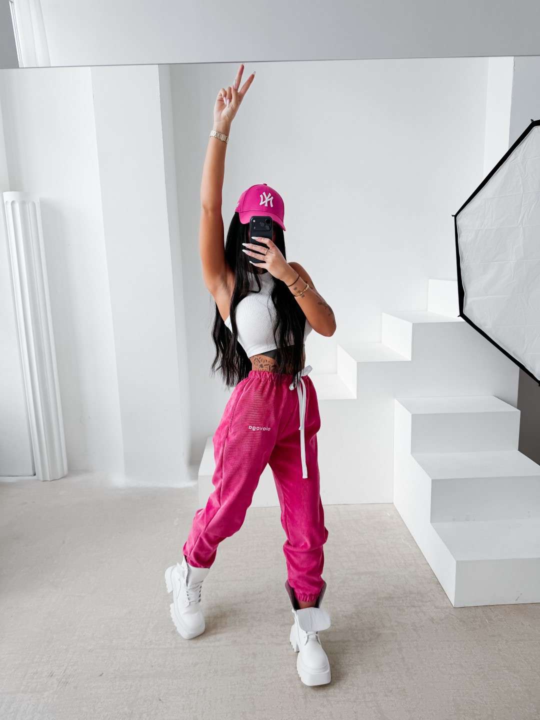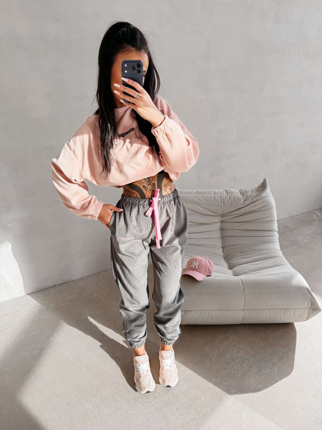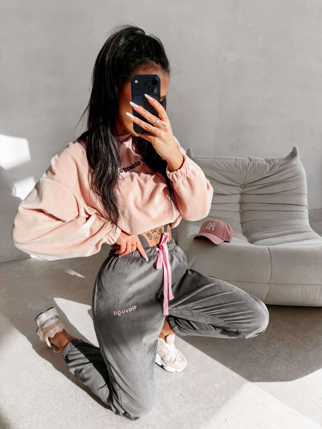 Wykonane z miękkiej, przyjemnej w dotyku dzianiny o subtelnej, welurowej strukturze. Nogawki wykończone ściągaczami oraz ozdobione delikatnym haftem OLAVOGA. Ważne aspekty: komfortowy fason, elastyczny pas z wiązaniem, miękka dzianina o welurowym wykończeniu, ściągacze przy nogawkach, haft marki OLAVOGA, casualowo-sportowy styl.