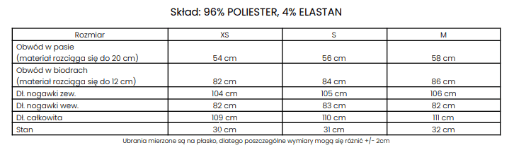 W talii logowana guma. Nogawki rozszerzane ku dołowi.