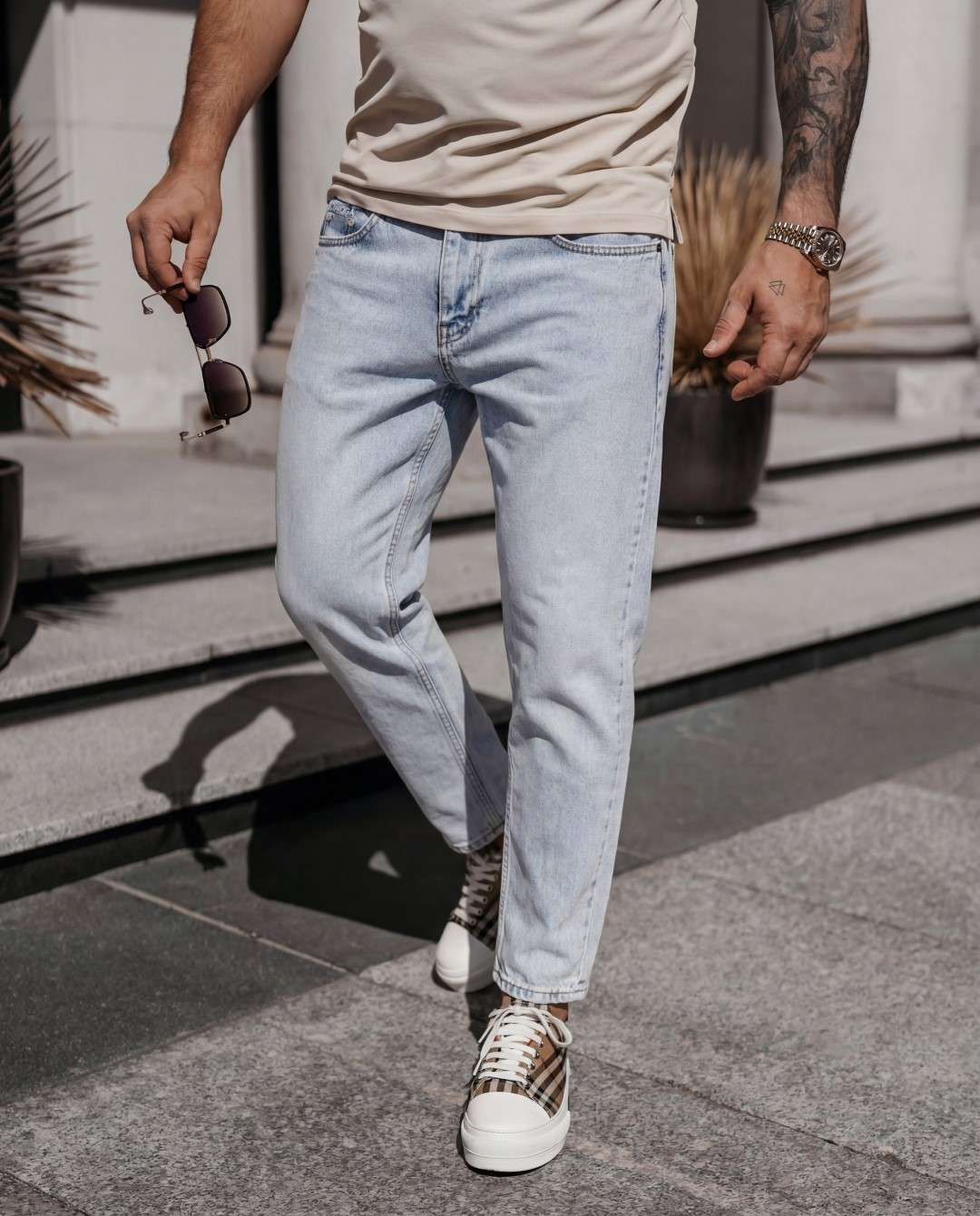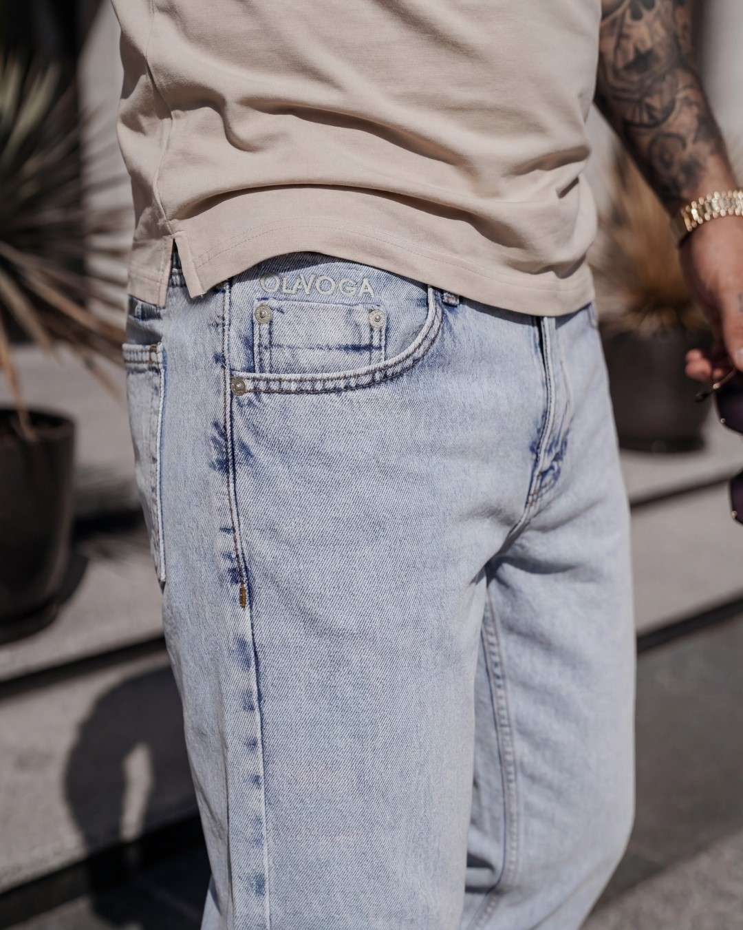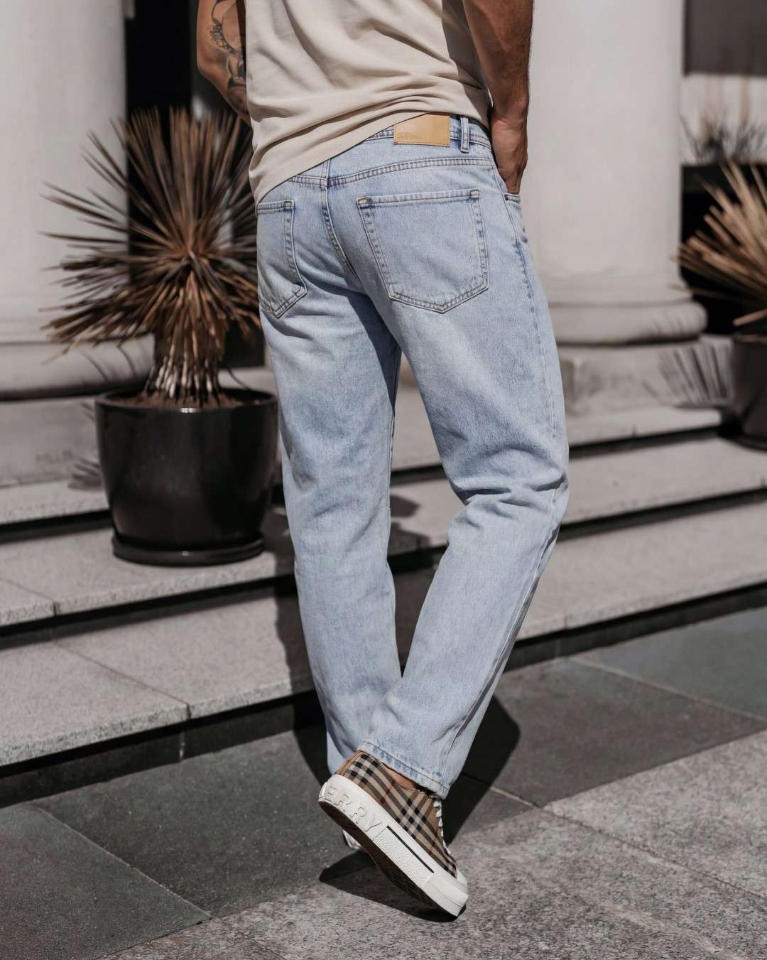 Jeansy męskie o prostym kroju. Zwężana nogawka. Jasny denim z delikatnym efektem sprania. Klasyczne kieszenie z przodu i z tyłu. Naszywka z logo w pasie oraz subtelne logo przy kieszeni.