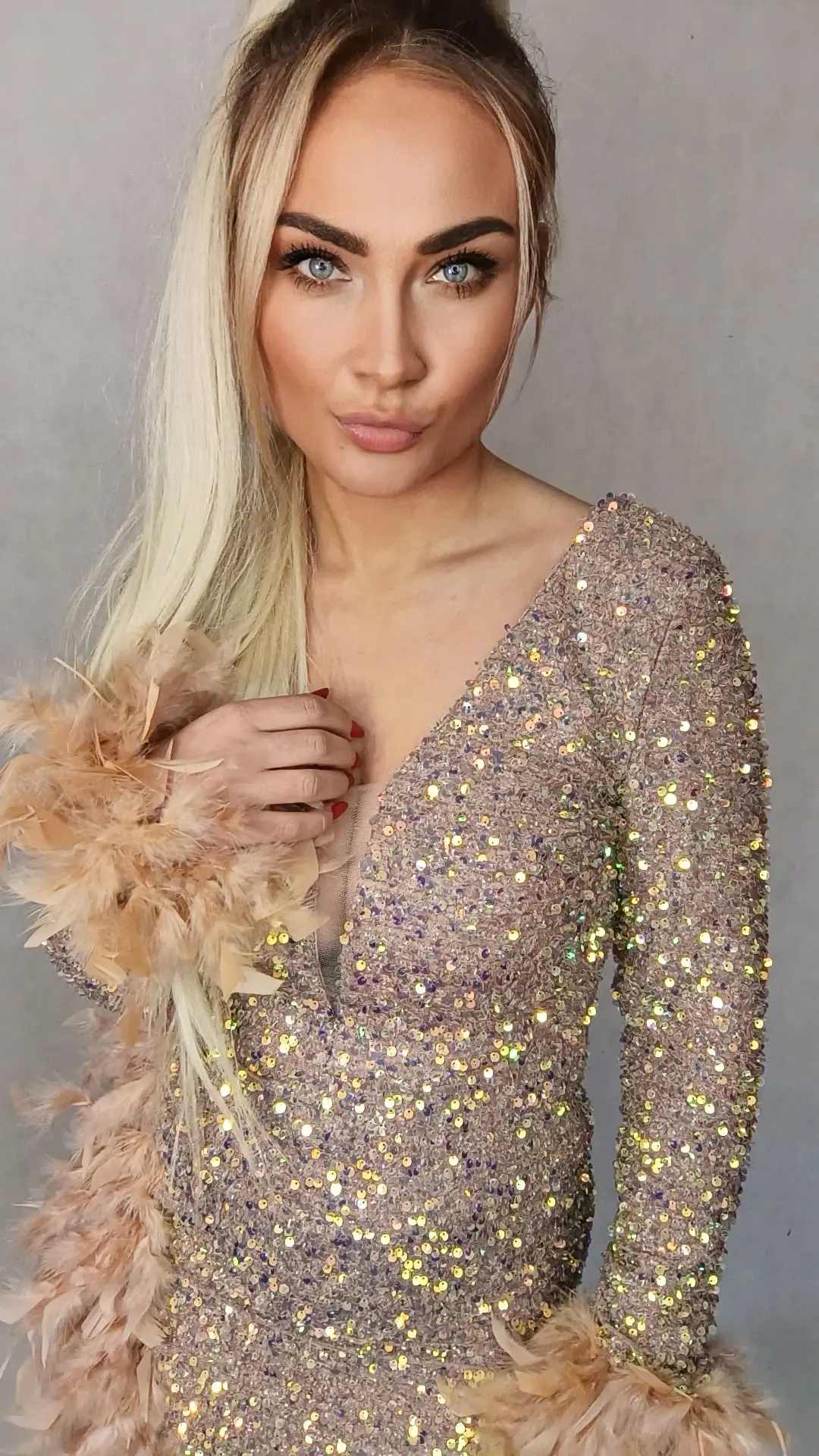 Ta olśniewająca cekinowa sukienka wieczorowa z długimi rękawami to doskonały wybór dla kobiet, które pragną zachwycać elegancją i wyrafinowaniem. Obszycie dodaje klasy, a niezwykły dół ozdobiony piórkami nadaje kreacji lekkości i oryginalności, przyciągając uwagę w każdej sytuacji.