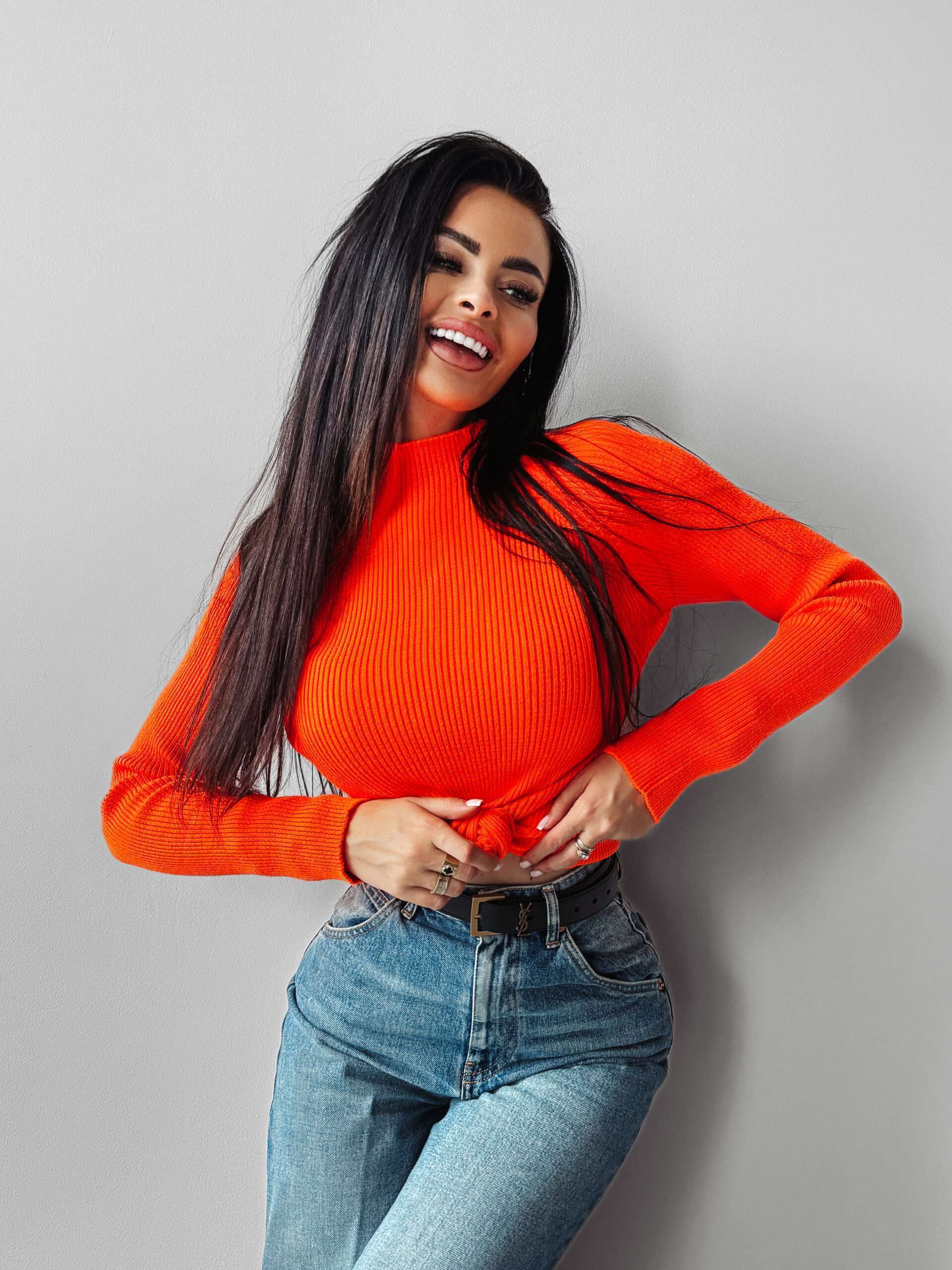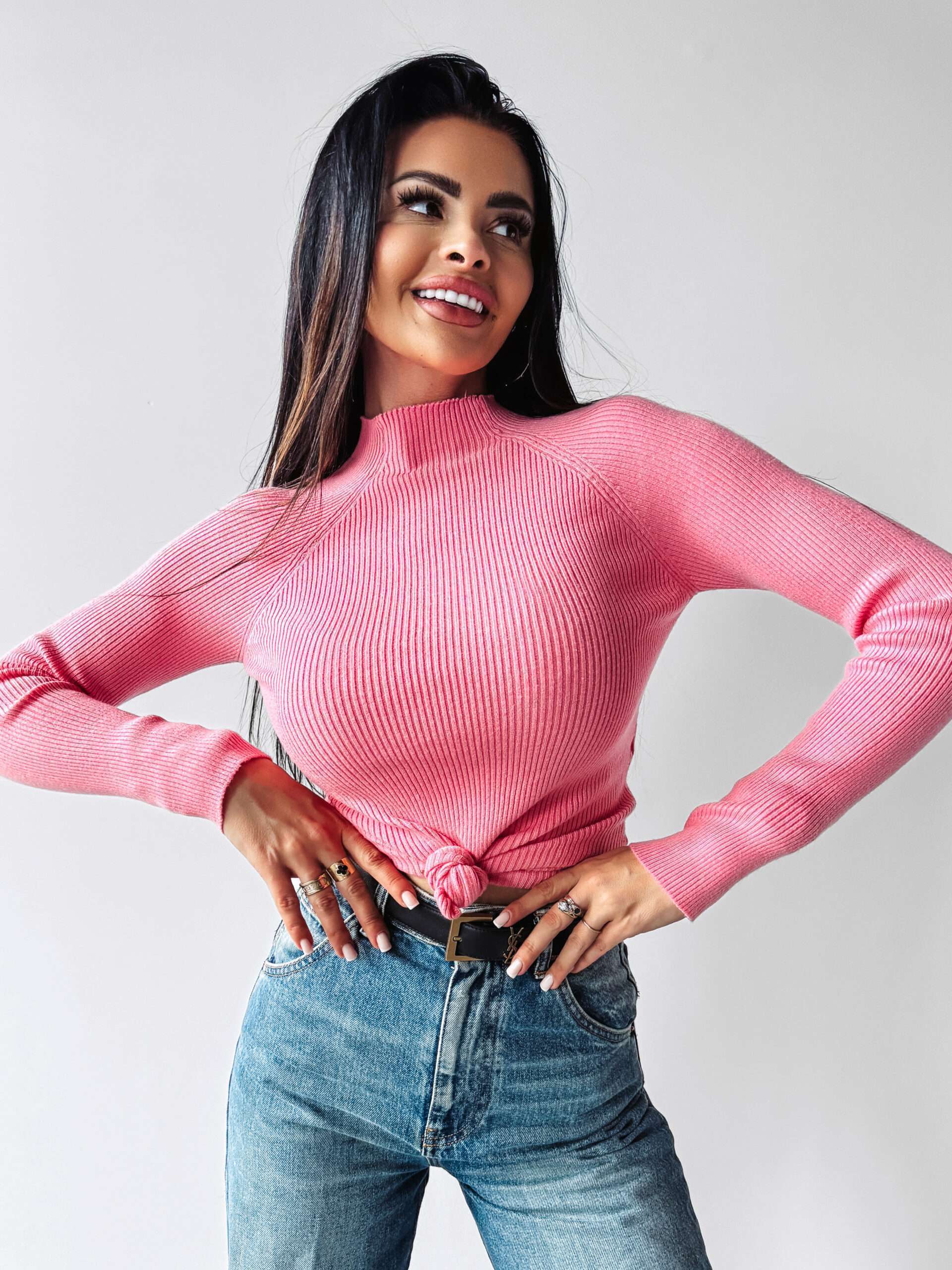 Przylegający sweter, o prostym kroju z długim rękawem. Wykonany z wysokiej jakości prążkowanego, elastycznego materiału. Posiada półgolf. Na przodzie minimalistyczne złote logo marki OLAVOGA.