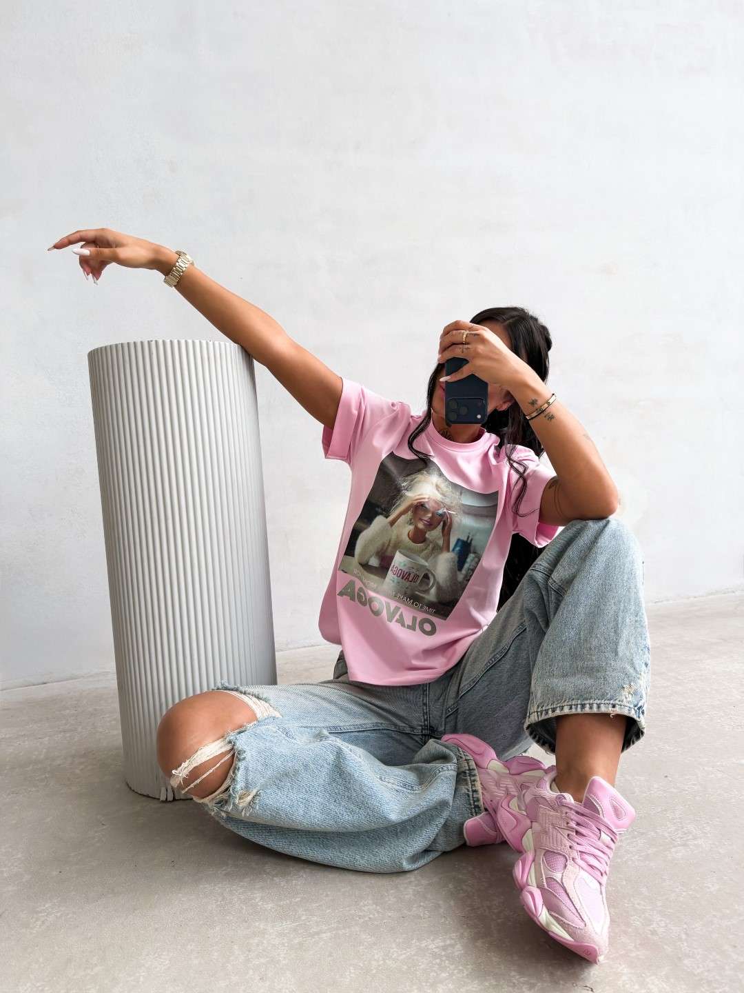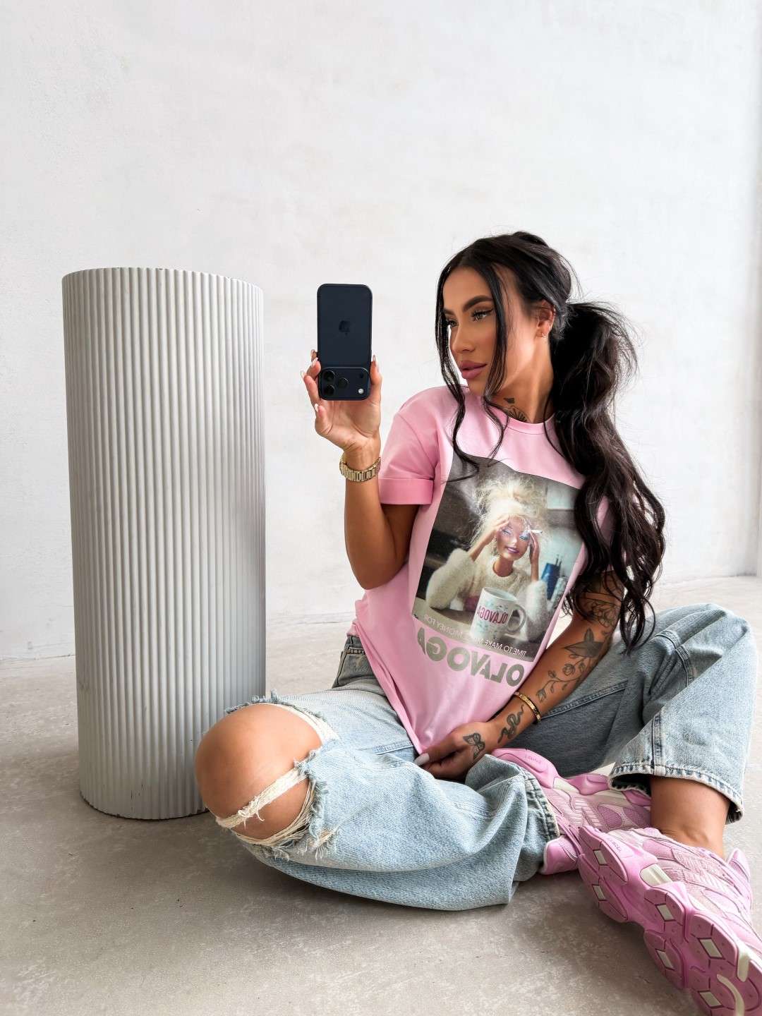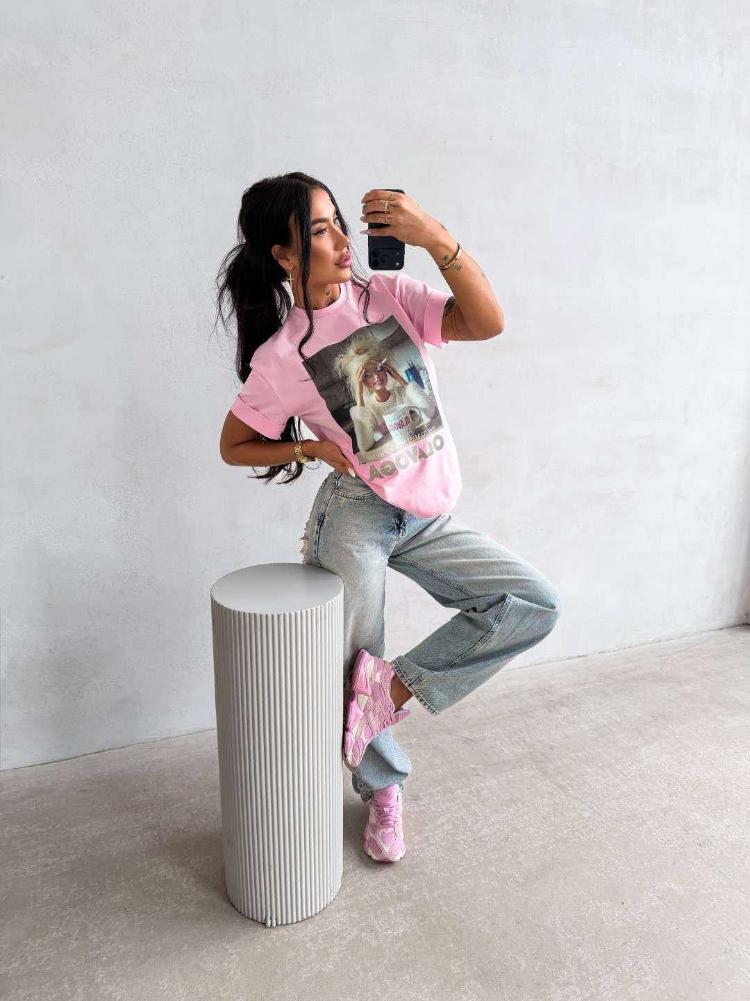 T-shirt o swobodnym kroju z krótkim rękawem i klasycznym, okrągłym dekoltem. Wykonany z miękkiej, przyjemnej w dotyku tkaniny. Z przodu duży nadruk graficzny z motywem Barbie oraz napisem OLAVOGA i hasłem.