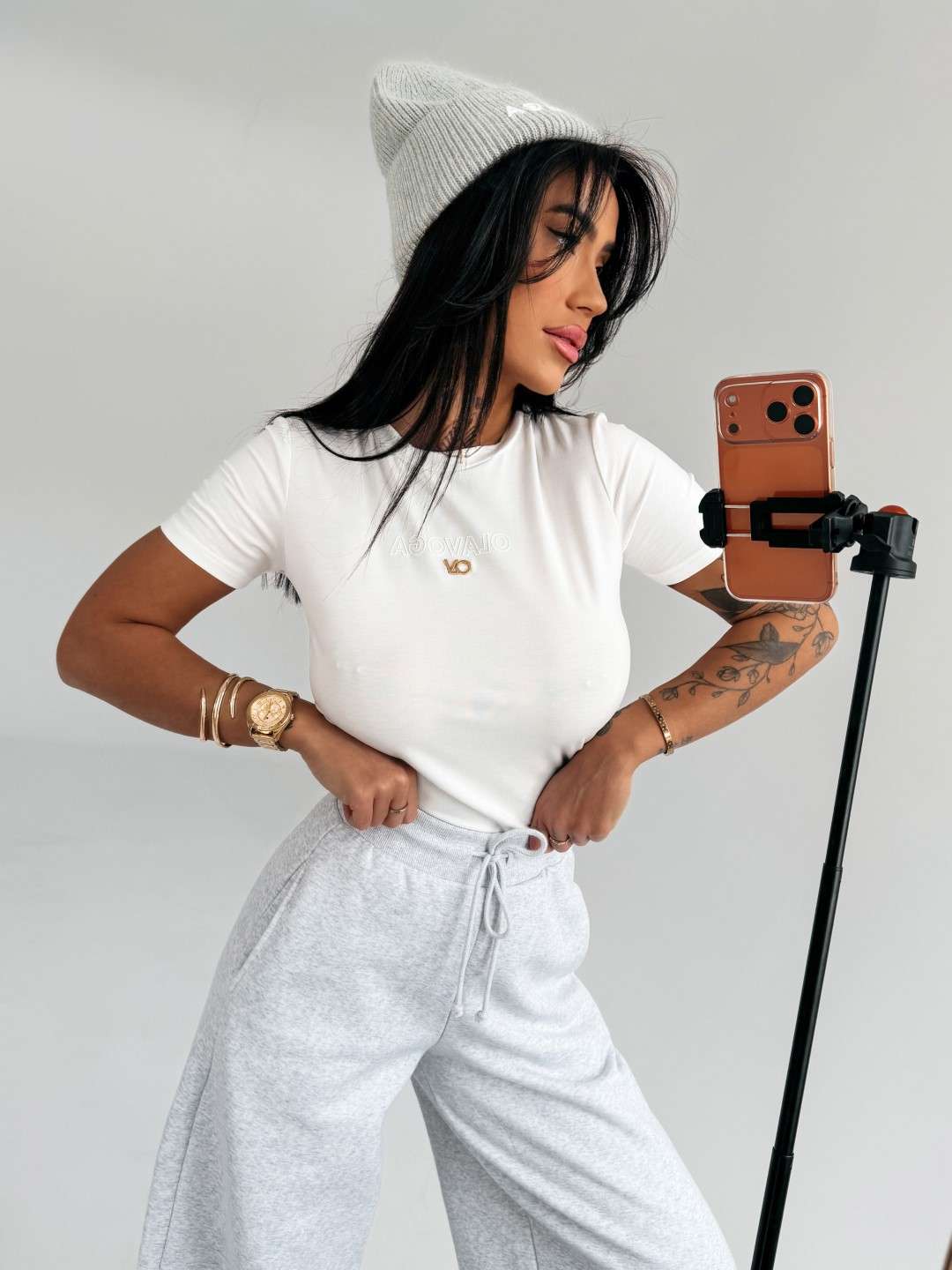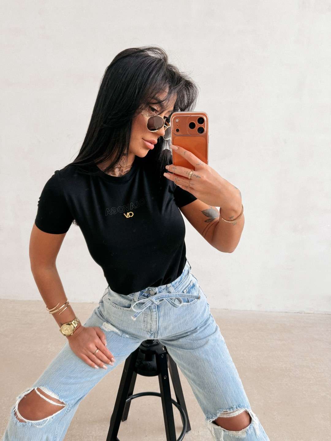 Idealnie dopasowany t-shirt o prostym kroju. Wykonany z wysokiej jakości, elastycznego materiału o gładkiej, miękkiej strukturze z domieszką wiskozy. Klasyczny krój z krótkim rękawem. Na przodzie delikatne, tłoczone logo marki OLAVOGA uzupełnione metalicznym detalem.