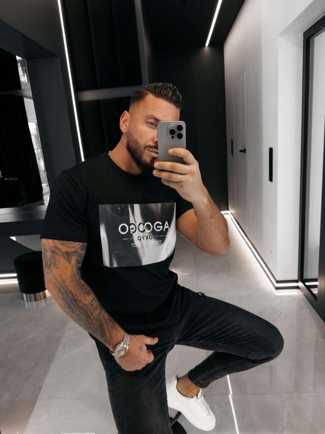 Casualowy t-shirt męski o klasycznym, prostym kroju. Wykonany z wysokogatunkowej, miękkiej w dotyku bawełny. Model z krótkim rękawem oraz okrągłym dekoltem. Na przodzie efektowna, graficzna aplikacja z logo marki OLAVOGA z napisem TOKYO.