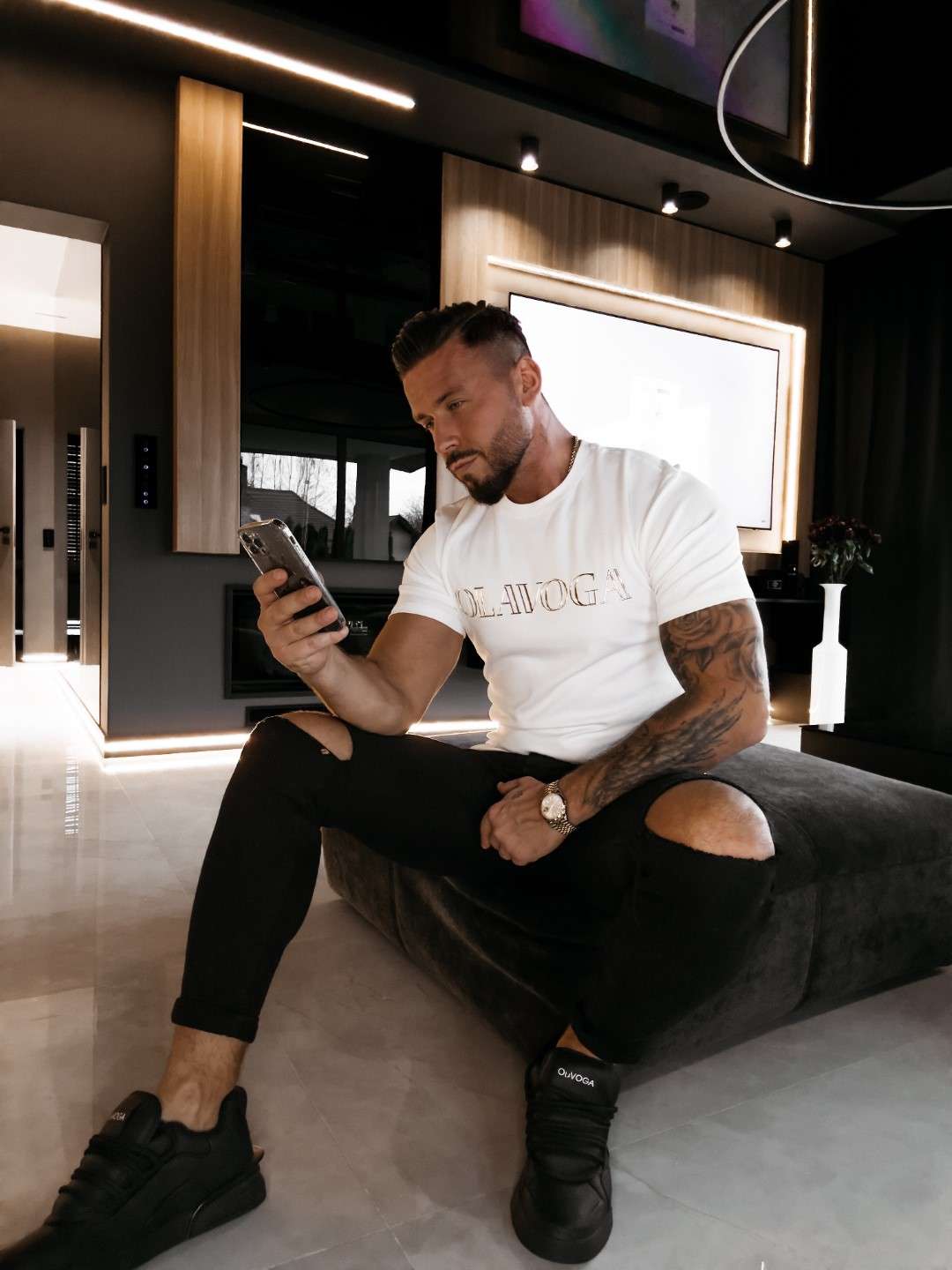 Klasyczny t-shirt o regularnym kroju z okrągłym dekoltem i krótkim rękawem. Wykonany z wysokiej jakości, miękkiej i przyjemnej w dotyku bawełny. Z przodu efektowne, przestrzenne logo marki OLAVOGA w metalicznym, złotym wykończeniu. Ważne aspekty: fason regular fit, okrągły dekolt, krótki rękaw, miękka bawełniana dzianina, aplikacja logo marki OLAVOGA w złotym, metalicznym efekcie z przodu.