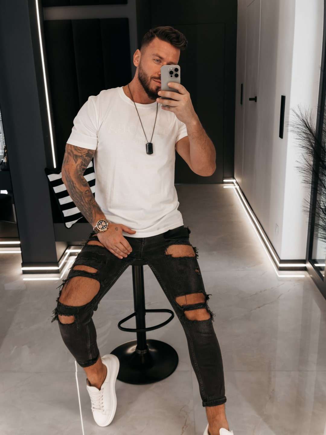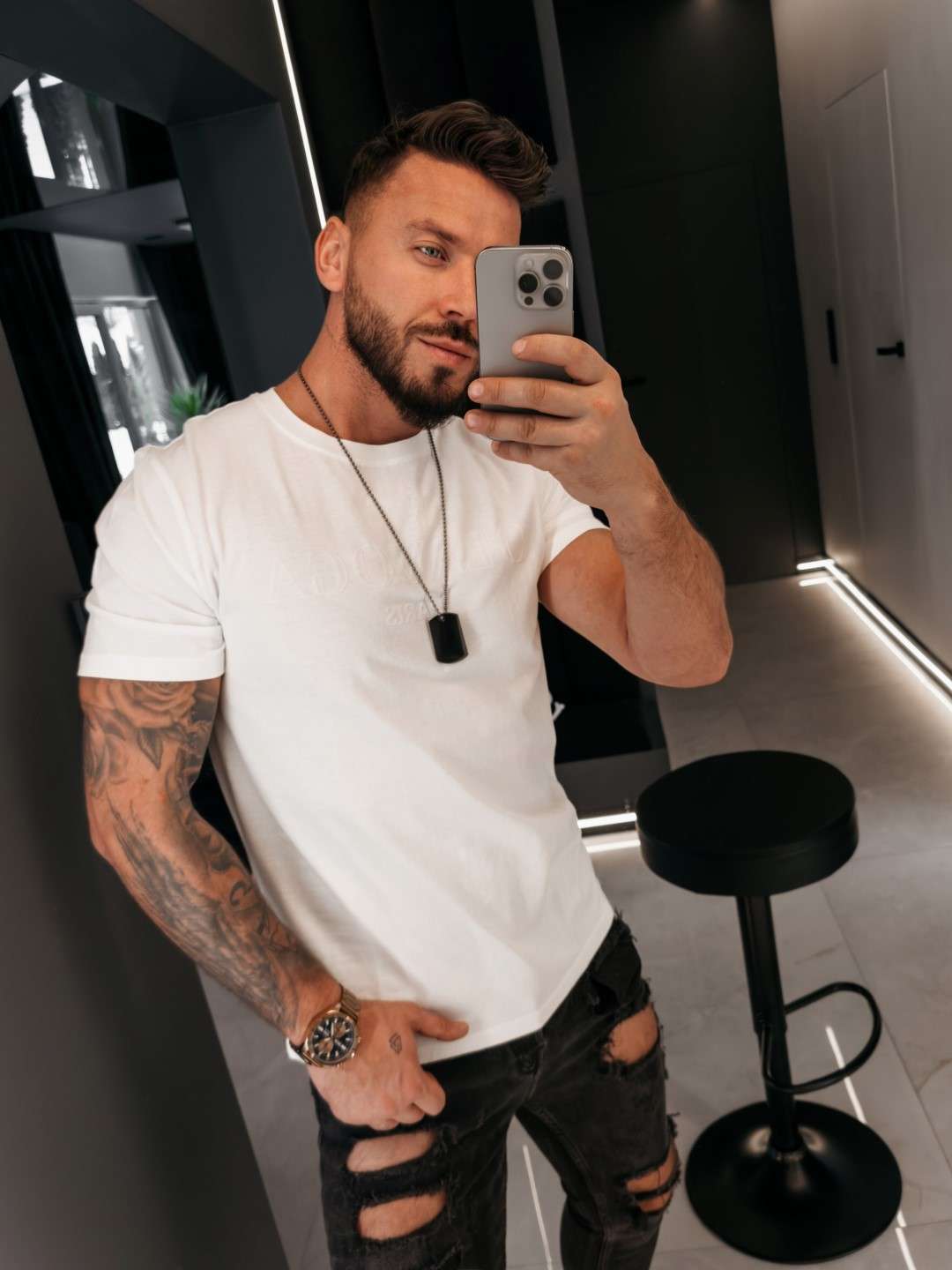 T-shirt męski o klasycznym, prostym kroju. Wykonany z wysokiej jakości, miękkiej bawełny o gładkiej strukturze. Model z okrągłym dekoltem oraz krótkim rękawem. Z przodu subtelne, tonalne logo marki OLAVOGA z napisem PARIS w eleganckim wykończeniu.
