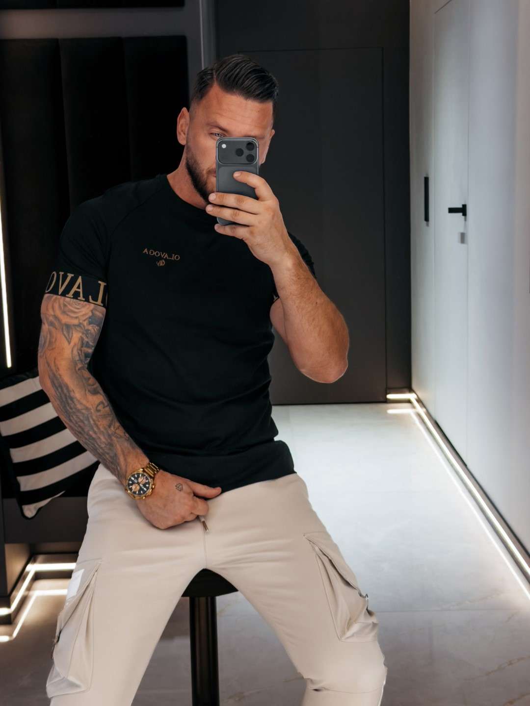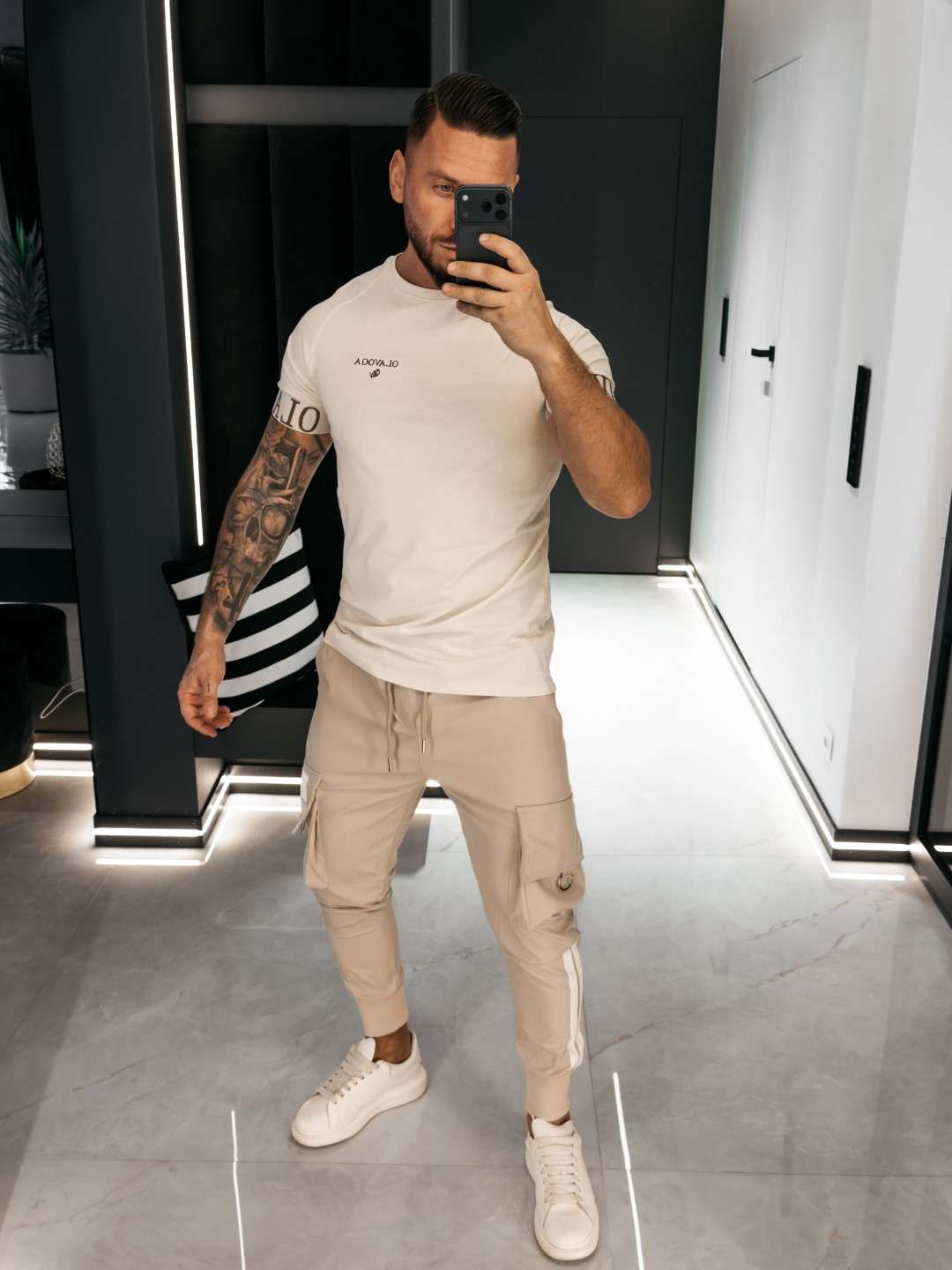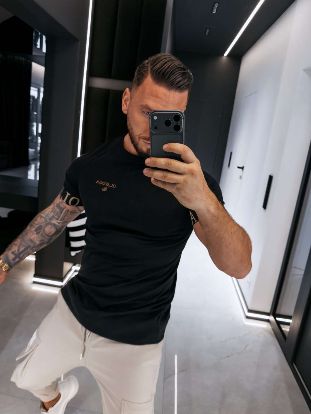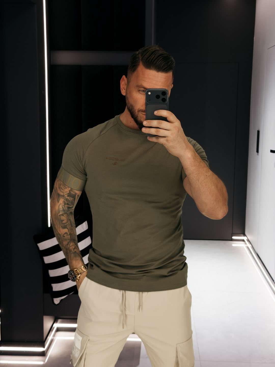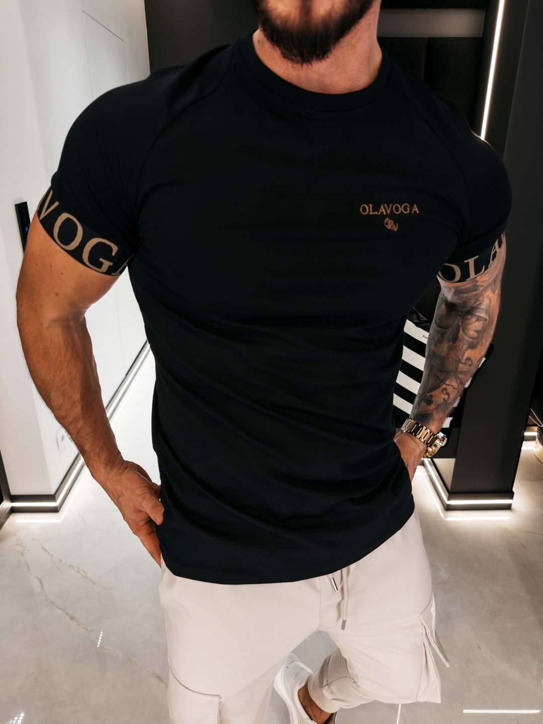 Casualowy t-shirt z krótkim rękawem o klasycznym kroju. Wykonany z wysokiej jakości elastycznej bawełny. Na przodzie subtelny haft z logo marki OLAVOGA, na rękawach logowane taśmy w kontrastowym kolorze.