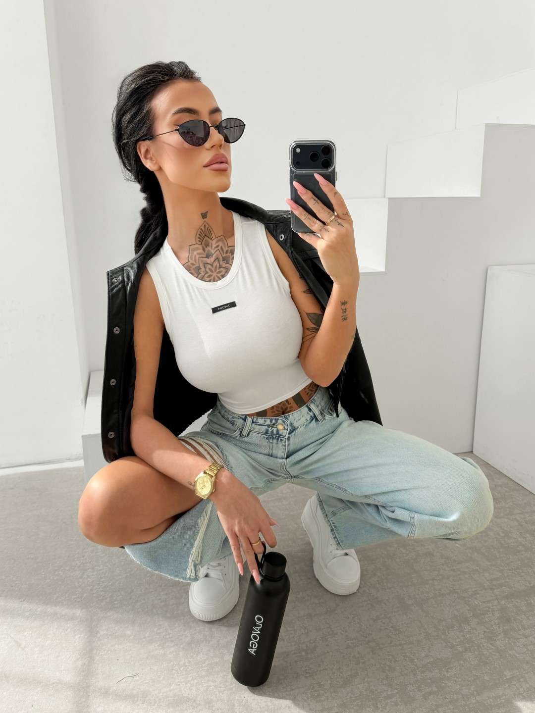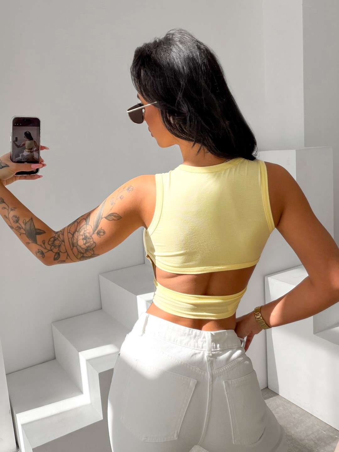 Top o dopasowanym kroju z okrągłym dekoltem. Model bez rękawów, wykonany z elastycznego materiału. Przód z subtelnym logo. Tył z wycięciem odsłaniającym plecy.
